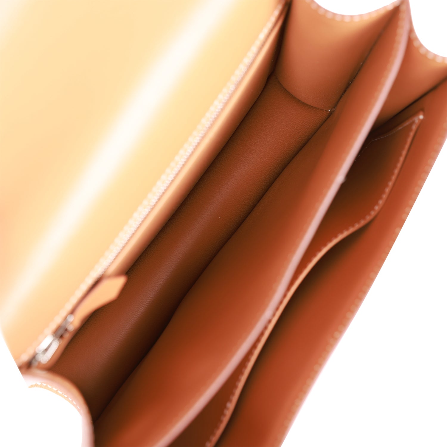 The interior is lined with gold lambskin leather and has a zip pocket with an Hermès engraved pull.