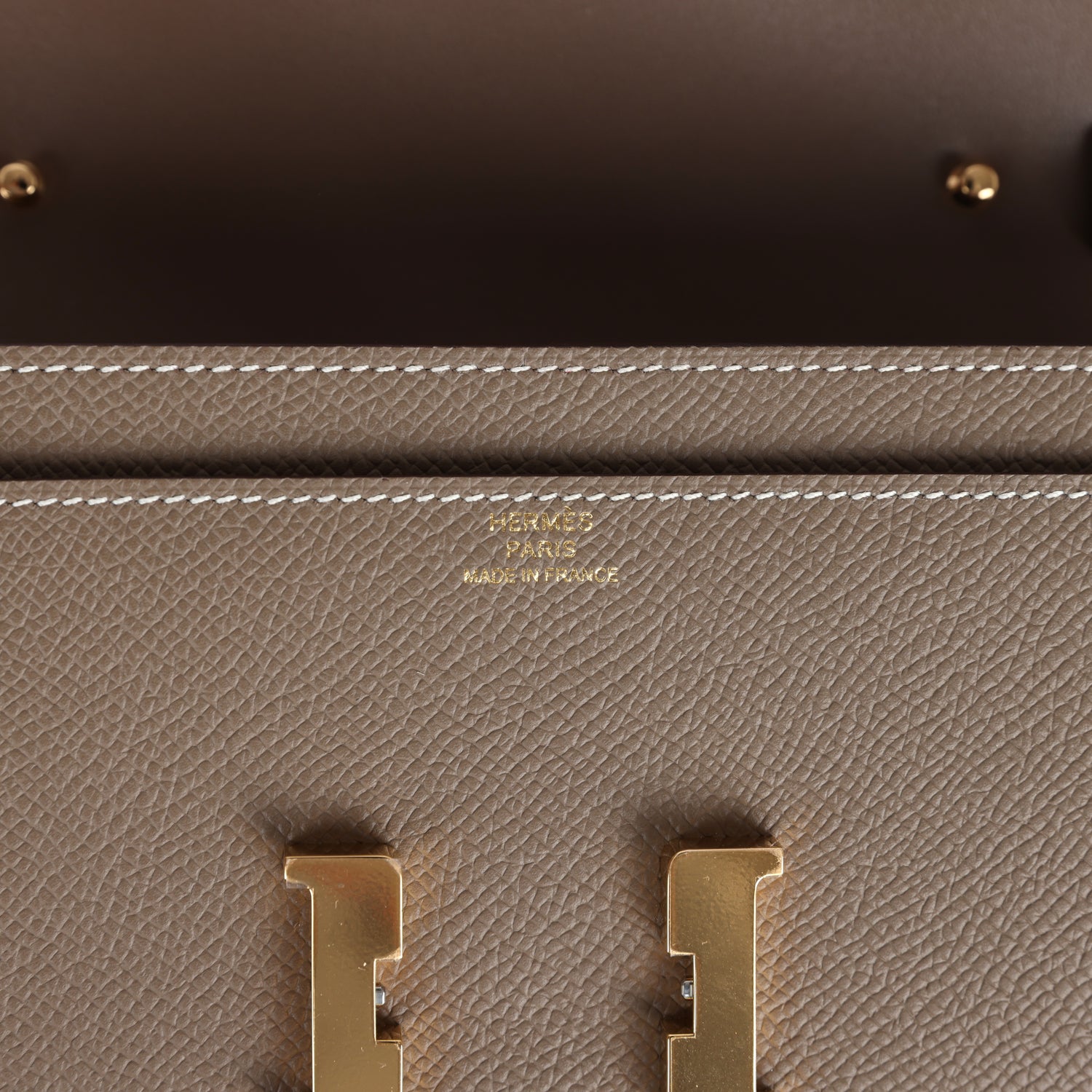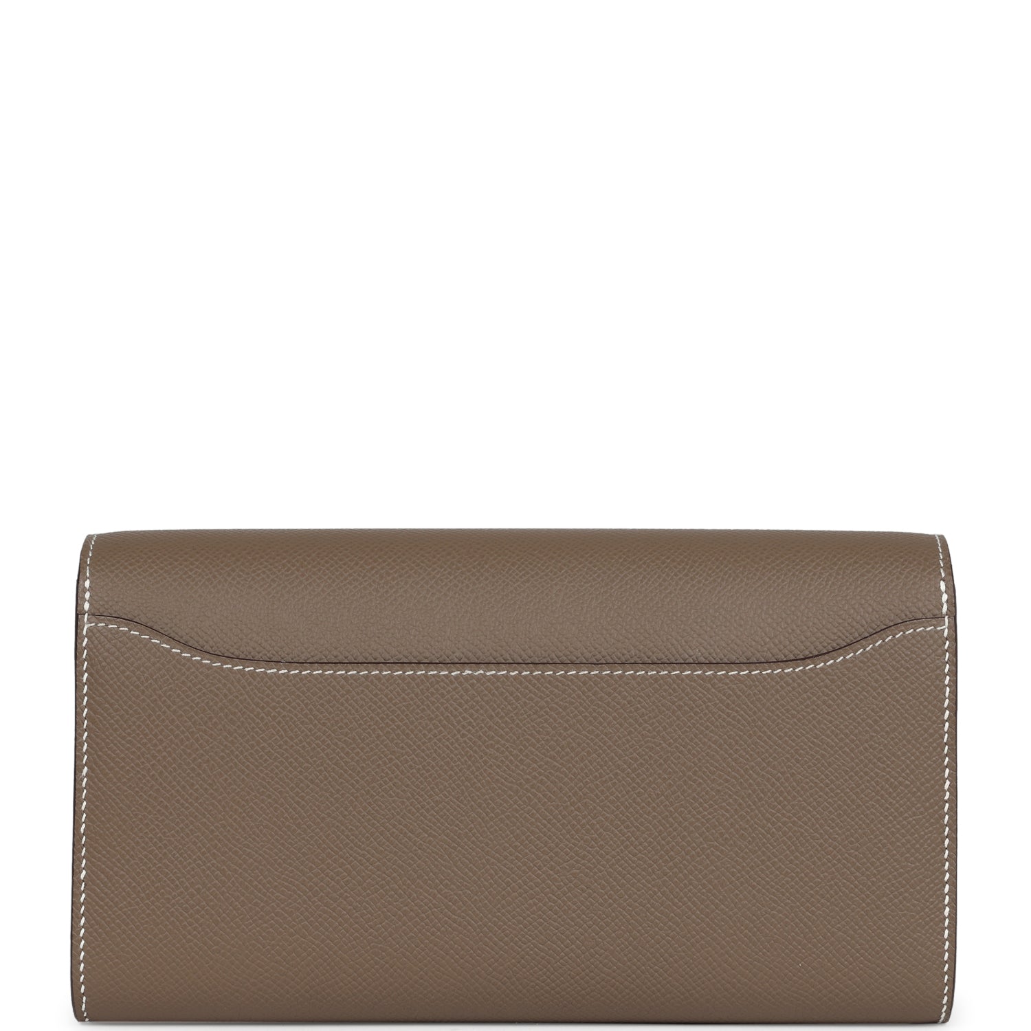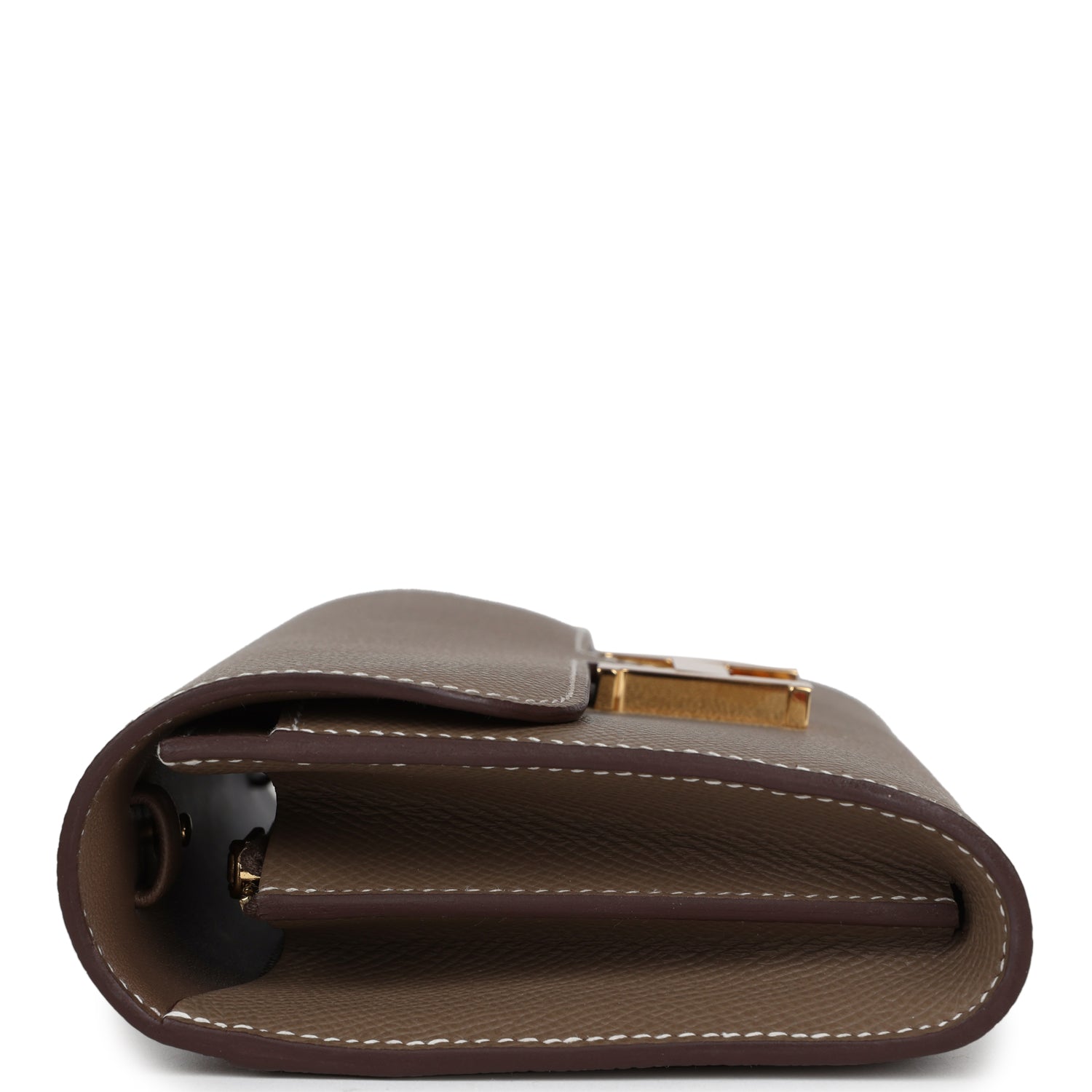 This Constance Wallet To Go is in Etoupe epsom leather with gold hardware and has contrast stitching, metal “H” snap lock closure, open front compartment and removable crossbody strap.