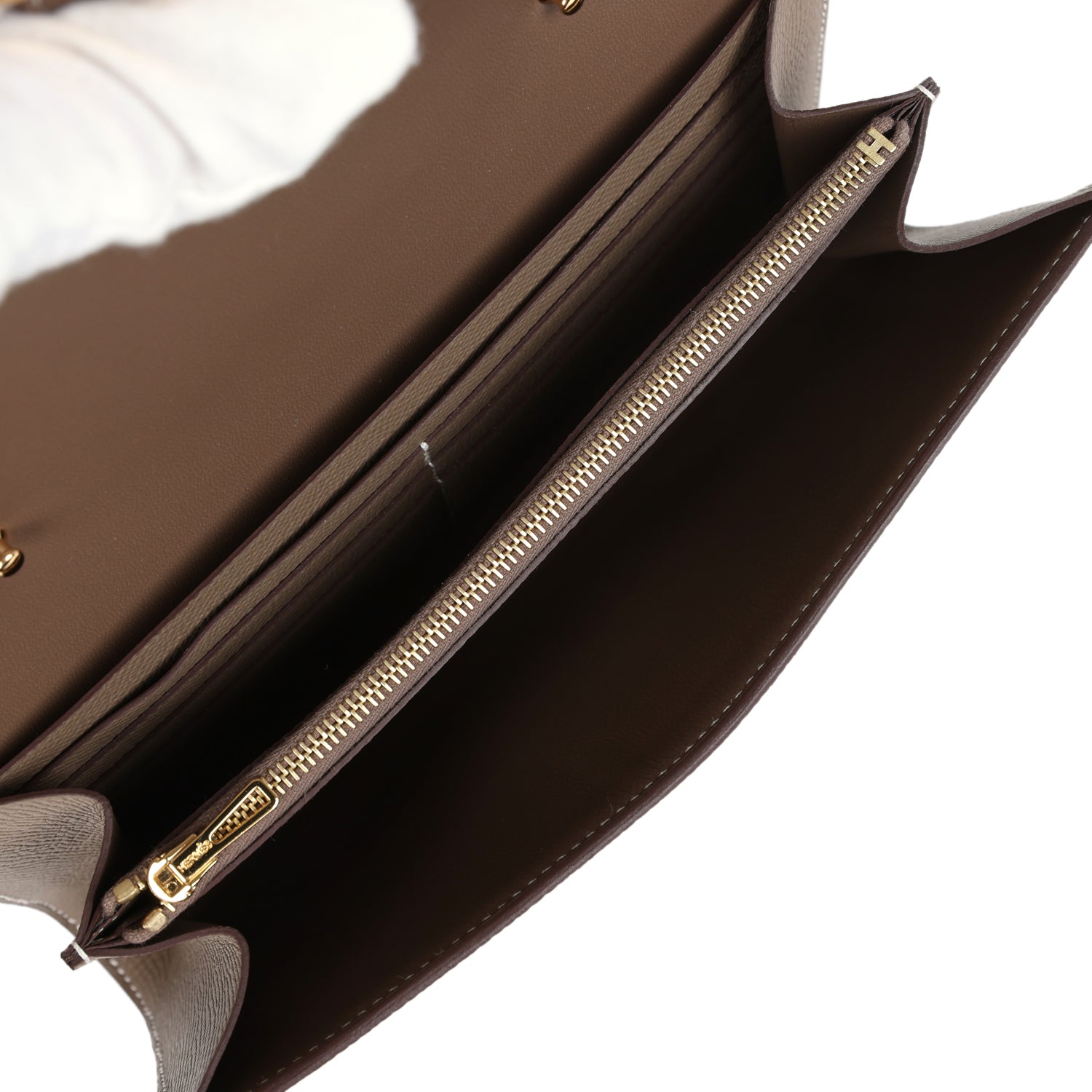 The interior is lined with Etoupe leather and two main compartments with six credit card slots and a zippered center compartment with Hermès H lock pull.