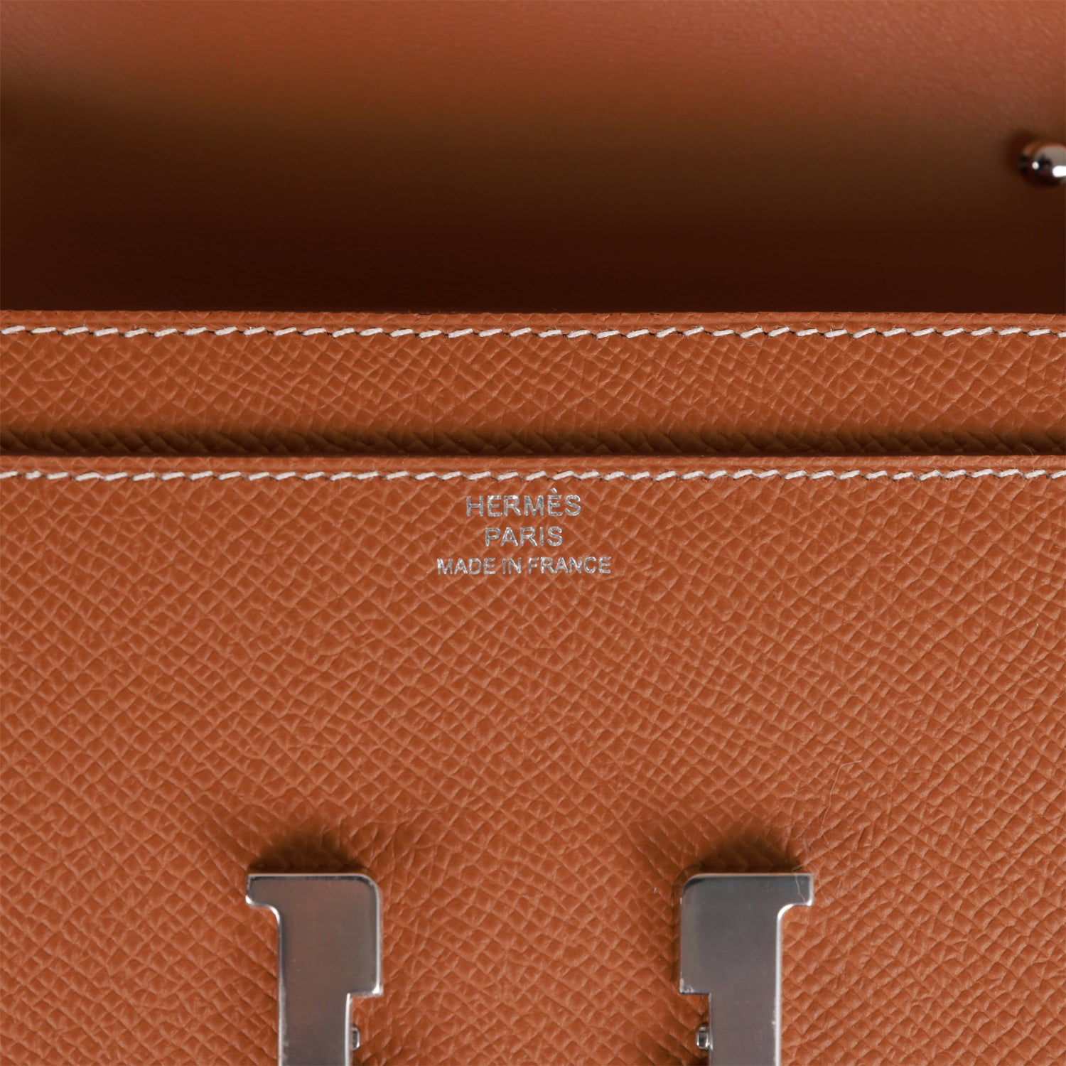The interior is lined with gold epsom leather and two main compartments with six credit card slots and a zippered center compartment with Hermès H lock pull.