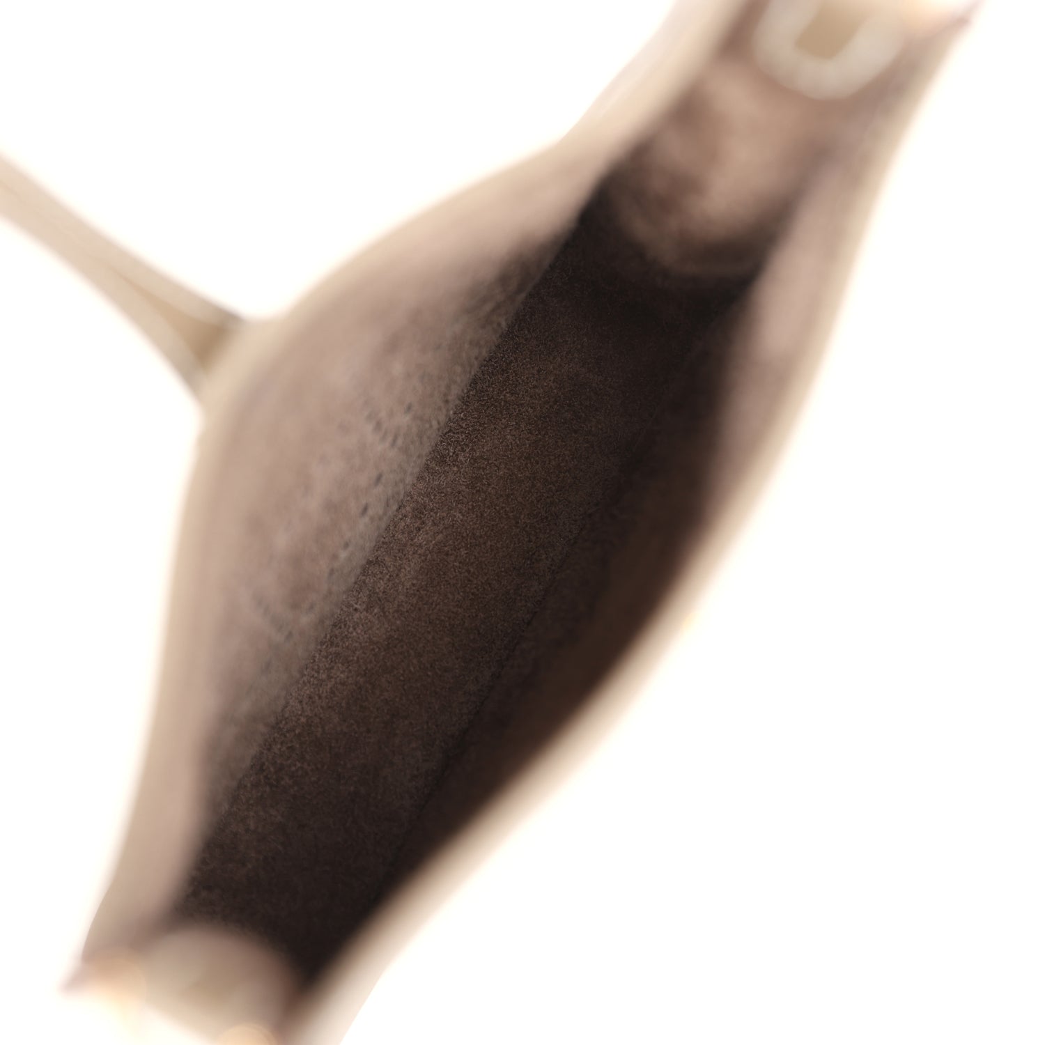 This Evelyne TPM is in Etoupe clemence leather with gold hardware and has contrast stitching, pull tab top closure and a removable canvas and leather shoulder/crossbody strap.