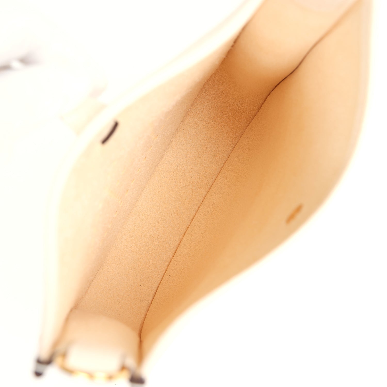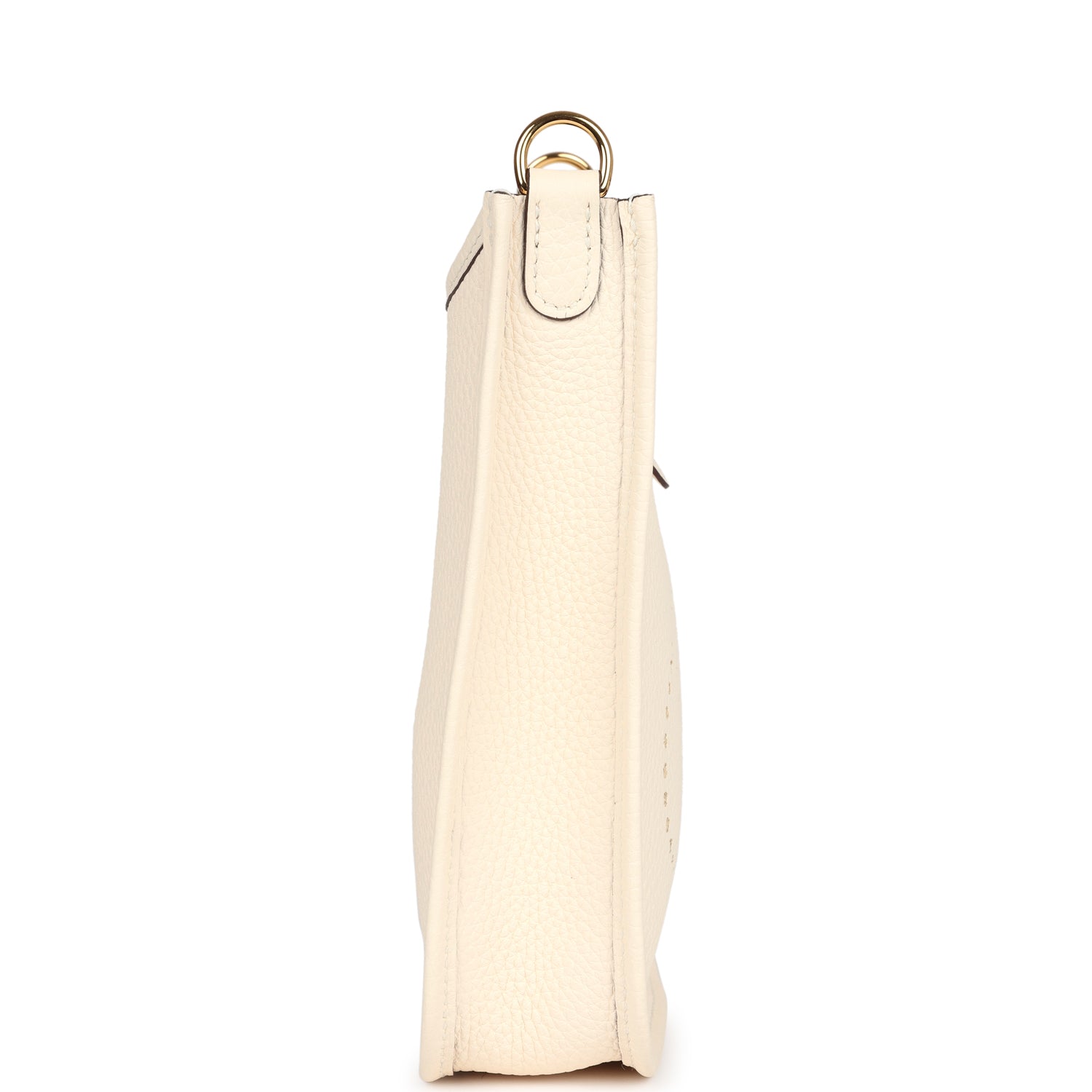 This Evelyne TPM is in Nata clemence leather with gold hardware and features tonal stitching, large perforated H in circle (front), pull tab top closure and a matching removable canvas and leather shoulder/crossbody strap.