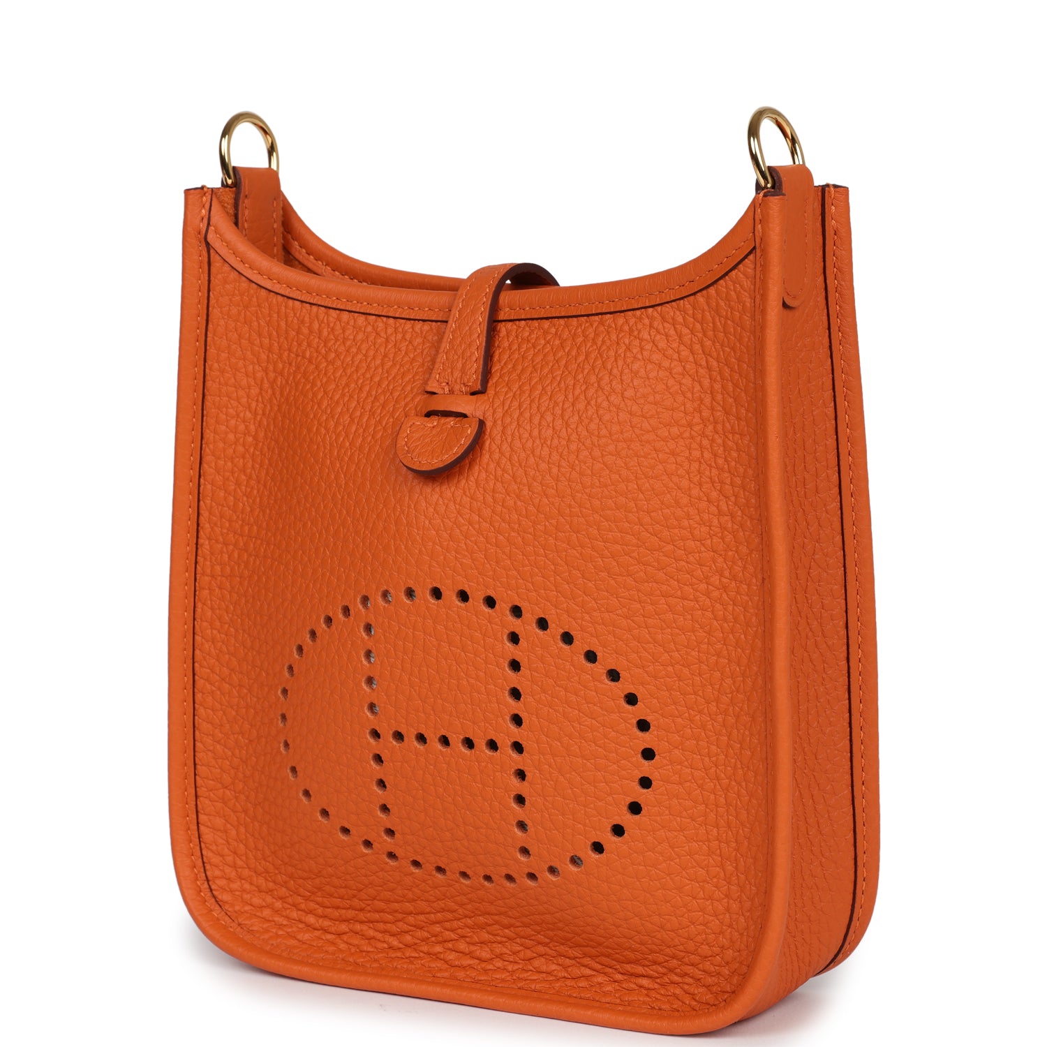 This Evelyne is in Orange clemence leather with gold hardware and has tonal stitching, pull tab top closure and an Orange removable canvas and leather shoulder/crossbody strap.