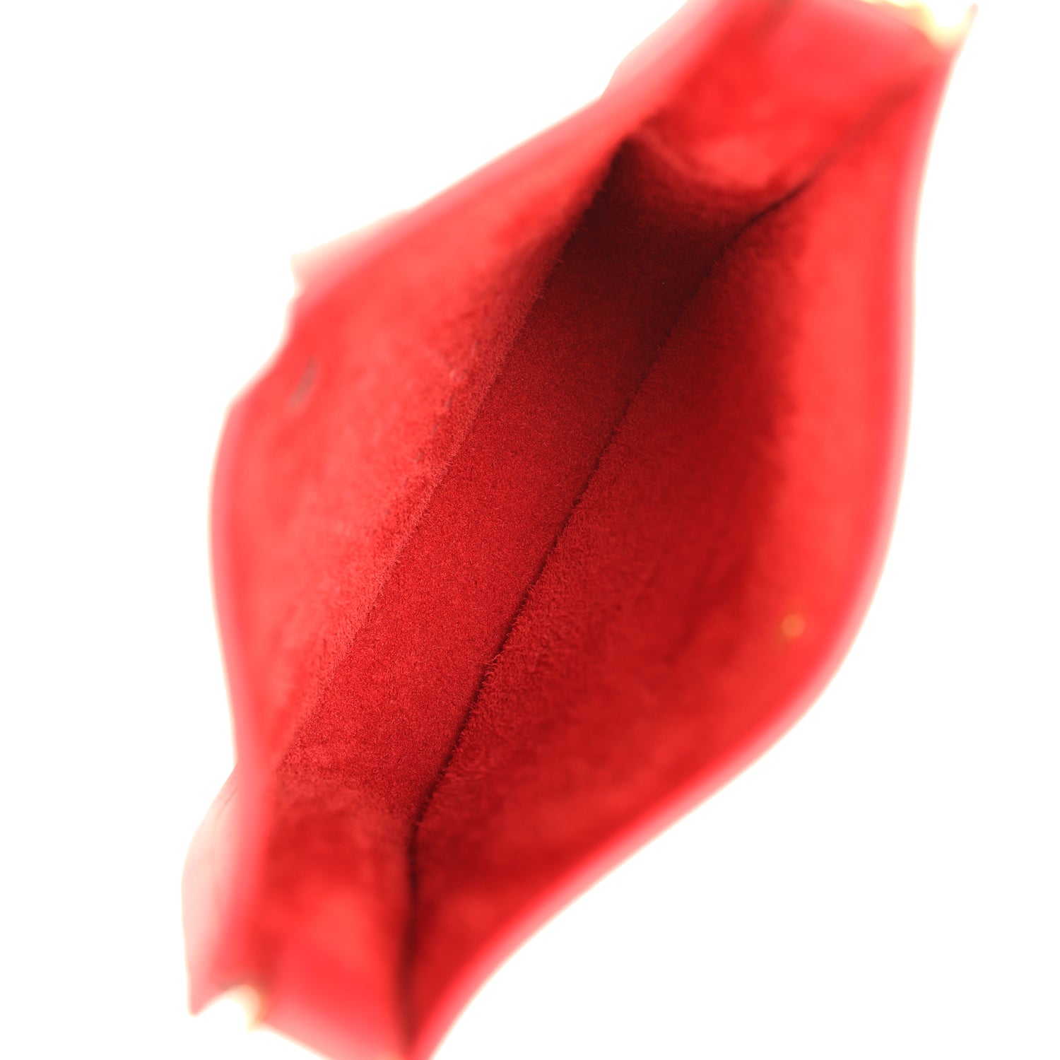 This Evelyne TPM is in Vermillion clemence leather with gold hardware and features tonal stitching, pull tab top closure and a matching removable canvas and leather shoulder/crossbody strap.