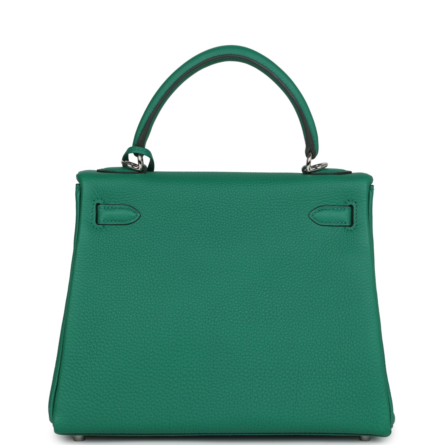 This Kelly, in the Retourne style, is in Vert Vertigo togo leather with palladium hardware and has tonal stitching, front flap, two straps with center toggle closure, clochette with lock and two keys, single rolled handle and an optional shoulder strap.