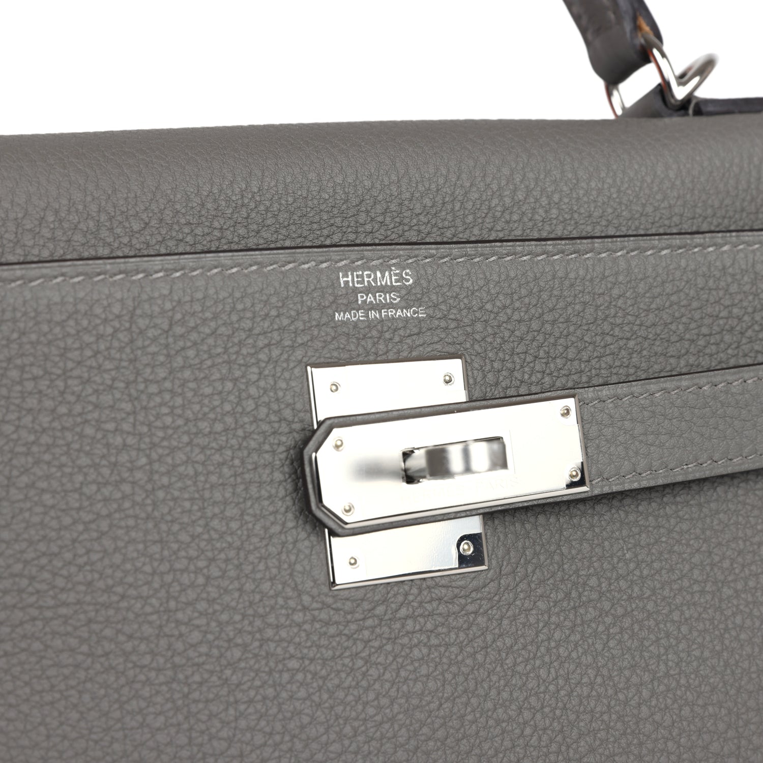 This Kelly, in the Retourne style, is in Gris Meyer togo leather with palladium hardware and has tonal stitching, front flap, two straps with center toggle closure, clochette with lock and two keys, single rolled handle and removable shoulder strap.