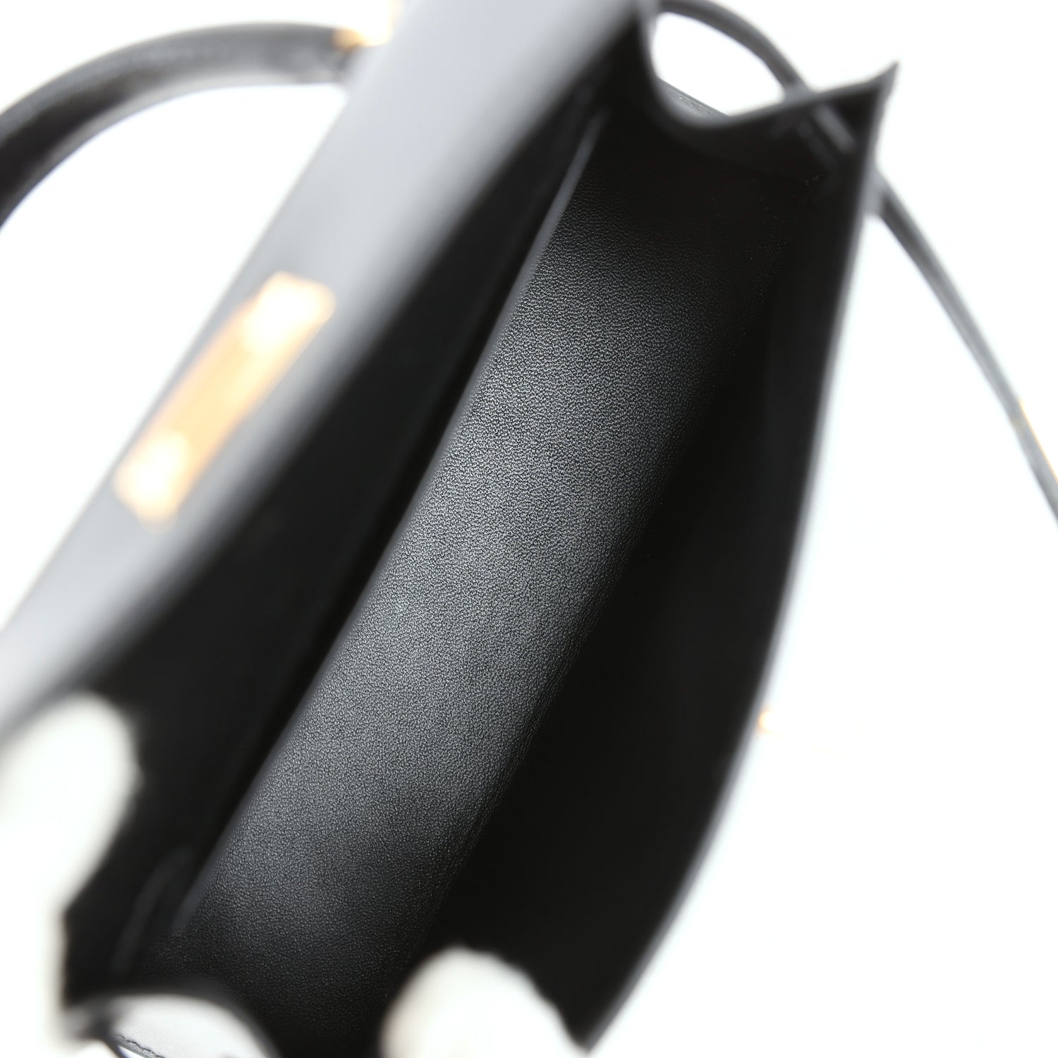 The interior is lined with black lambskin leather and has one open pocket on the back wall.