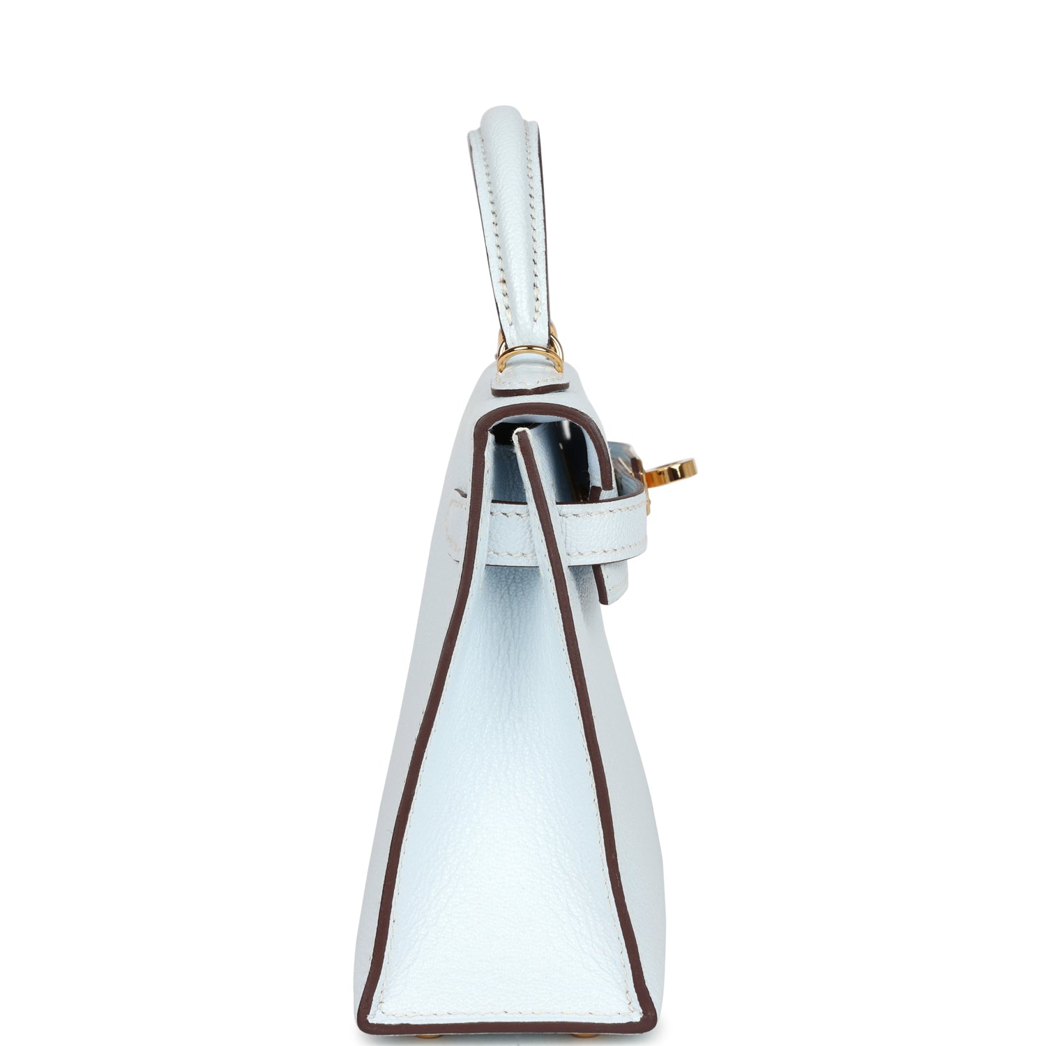 This Kelly, in the Sellier style, is in Bleu Brume chevre mysore leather with gold hardware and has tonal stitching, two straps with front toggle closure, single rolled handle and removable wooly/canvas shoulder strap.