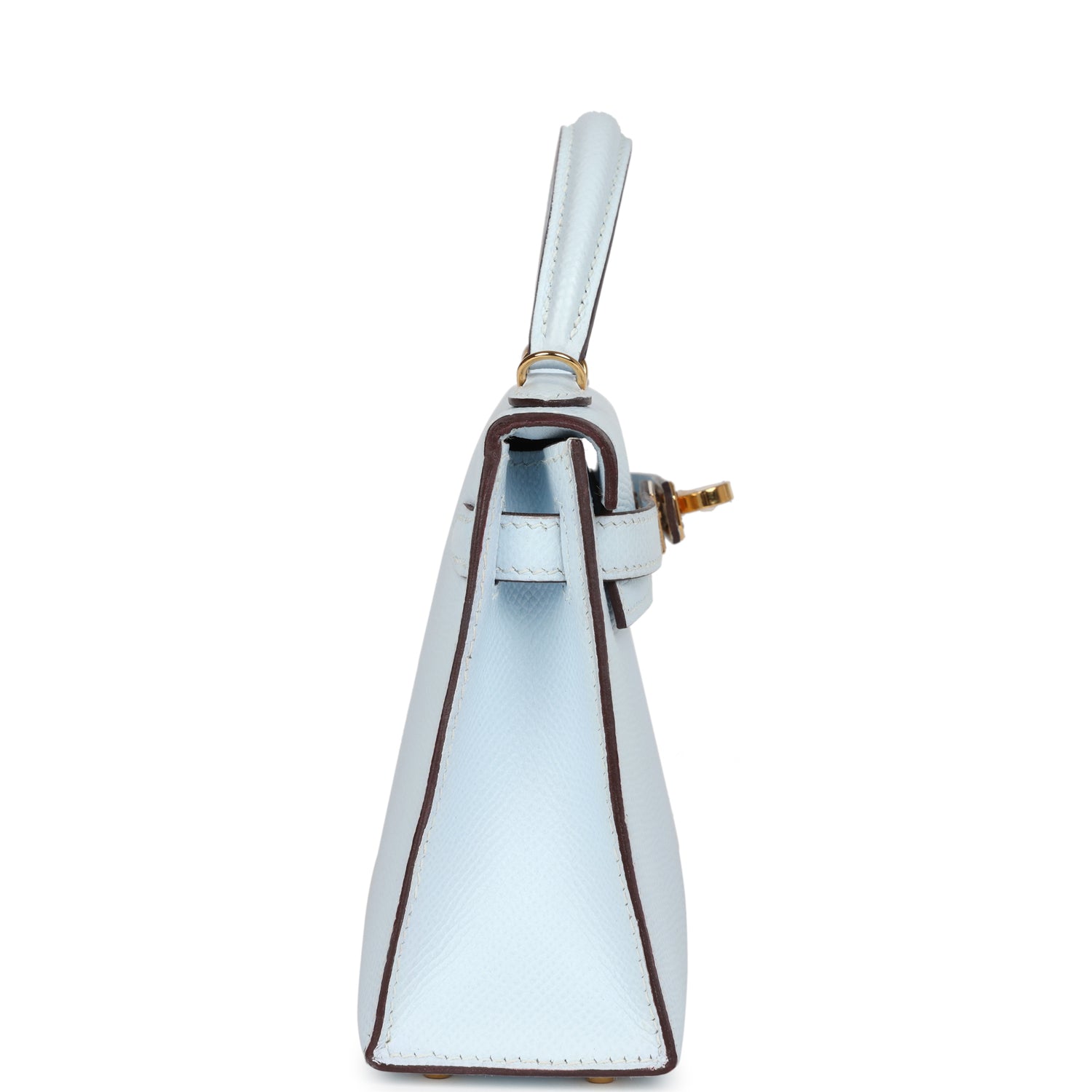 This Kelly, in the Sellier style, is in Bleu Brume epsom leather with gold hardware and has tonal stitching, two straps with front toggle closure, single rolled handle and removable shoulder strap.