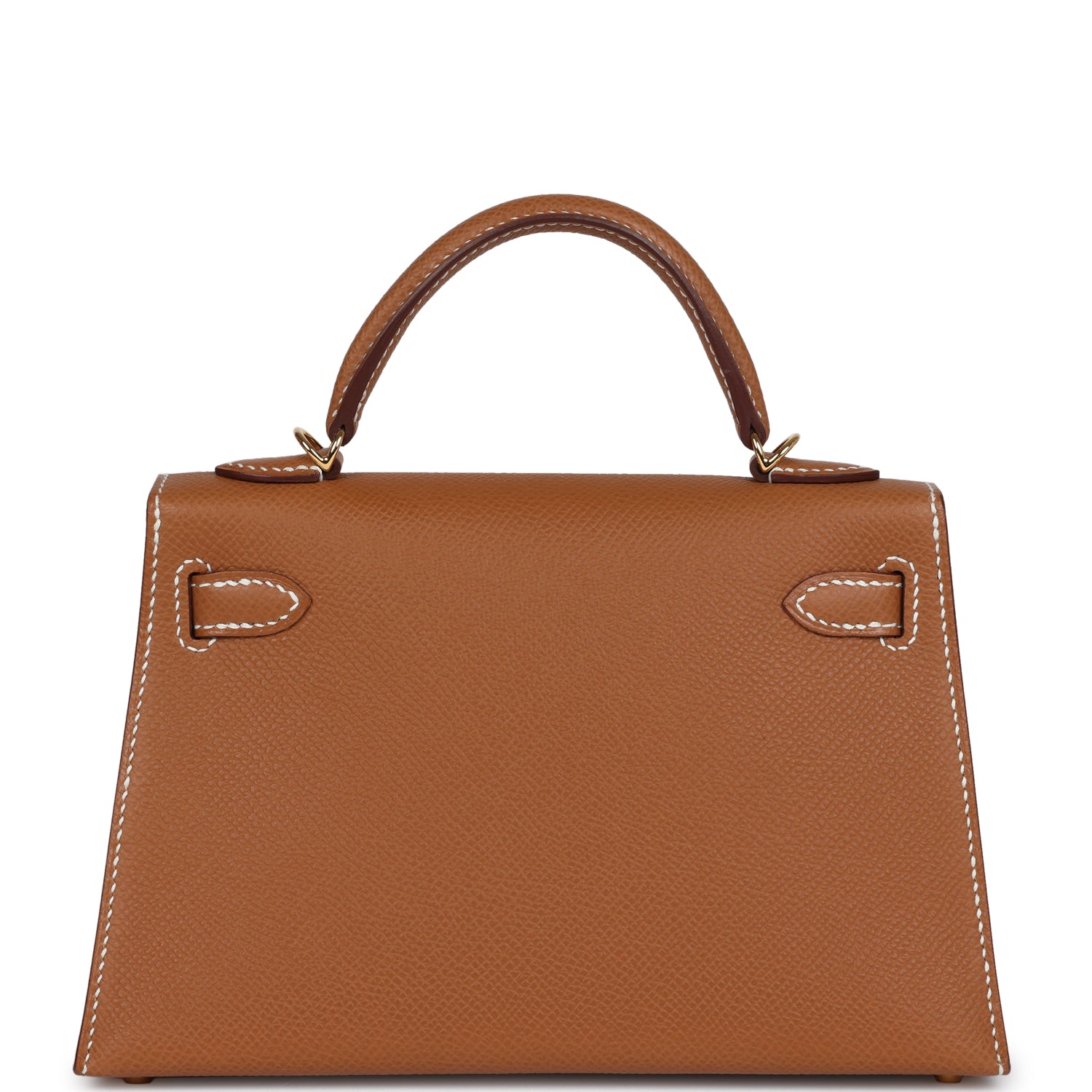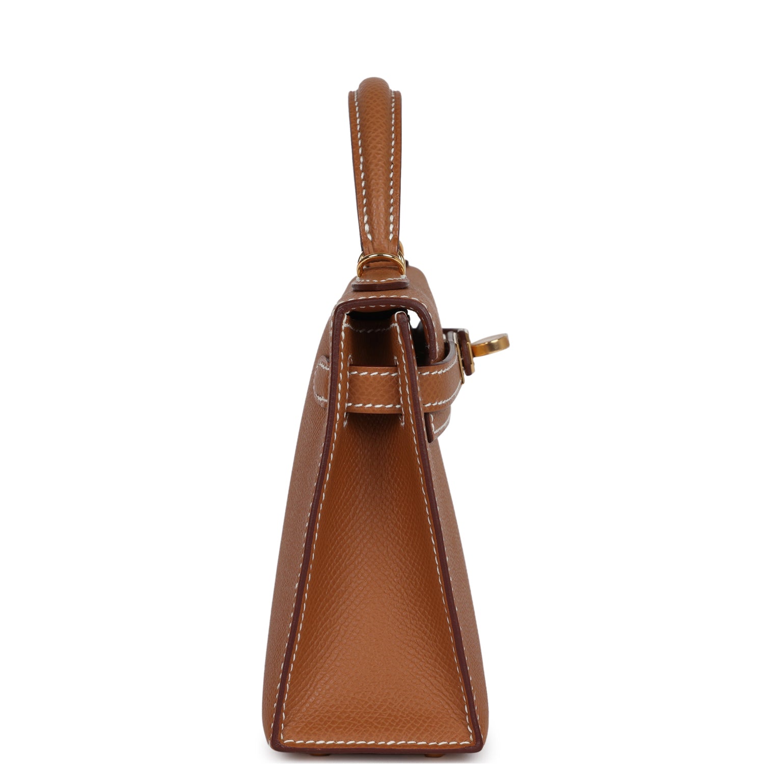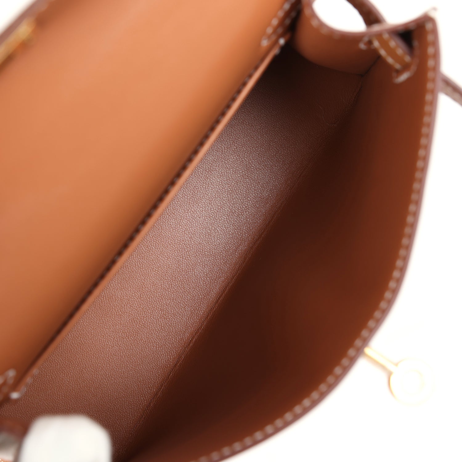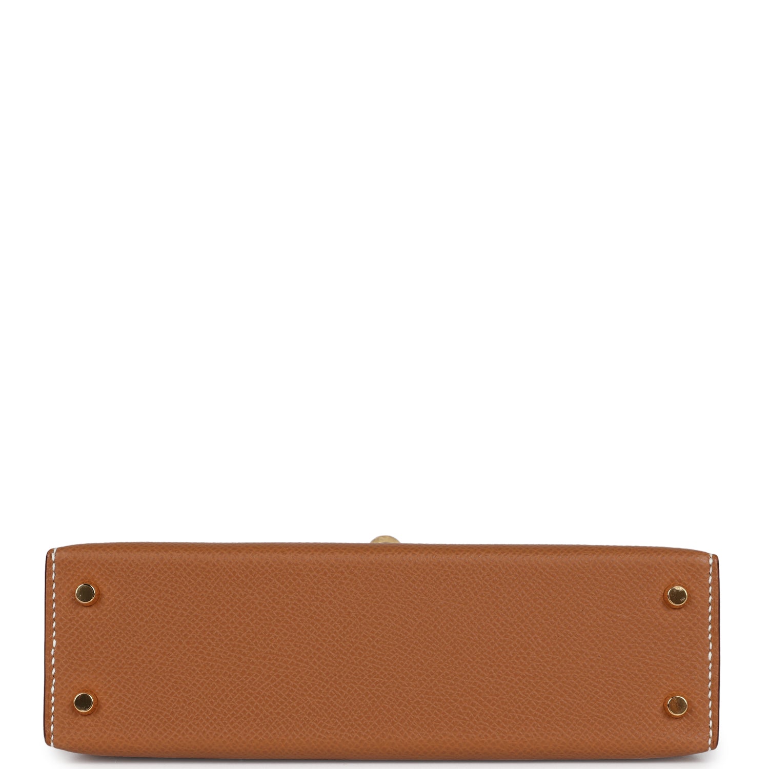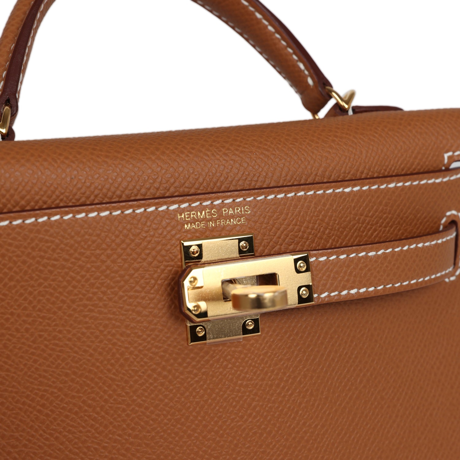 This Kelly, in the Sellier style, is in Gold epsom leather with gold hardware and has contrast stitching, two straps with front toggle closure, single rolled handle and removable shoulder strap.