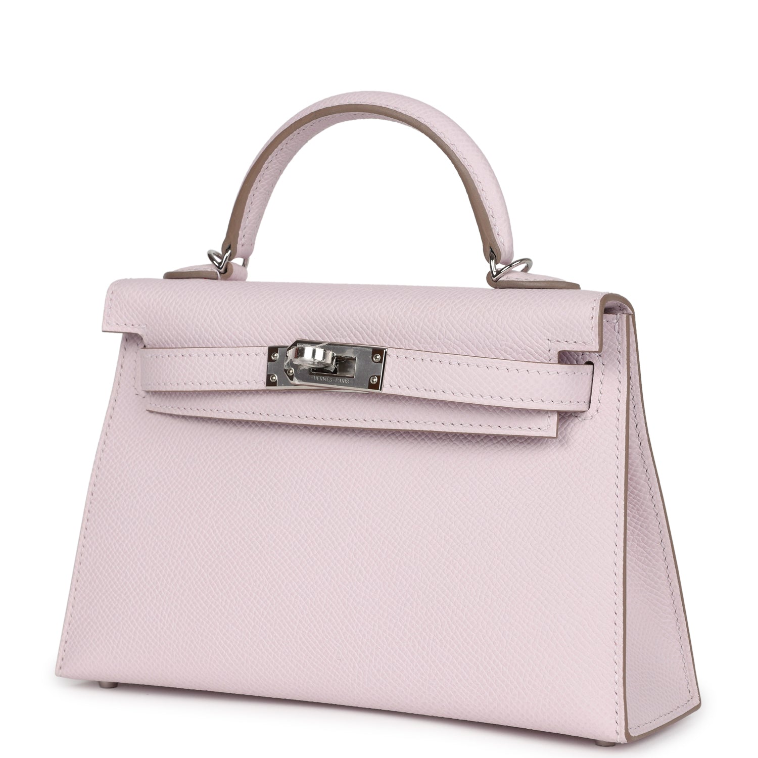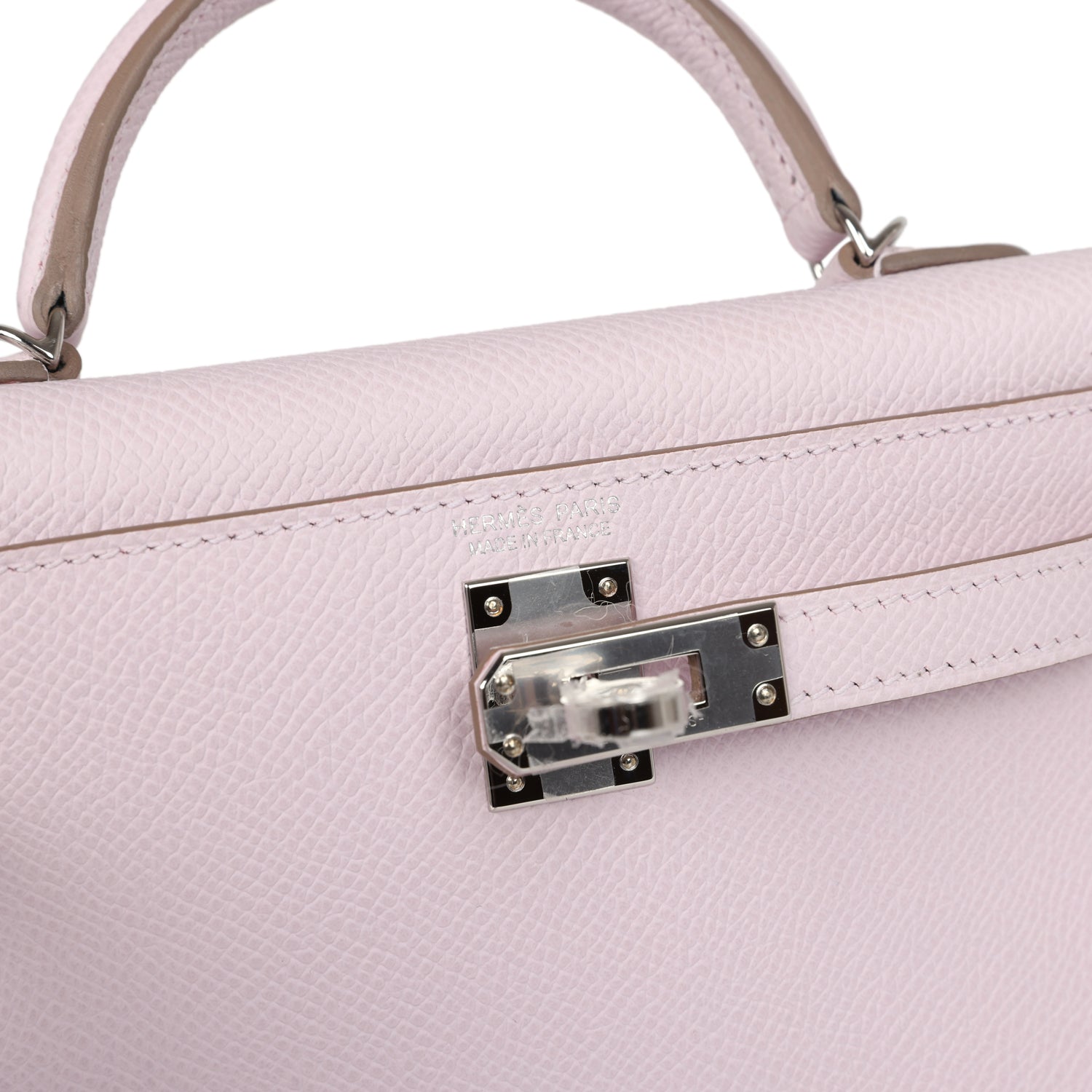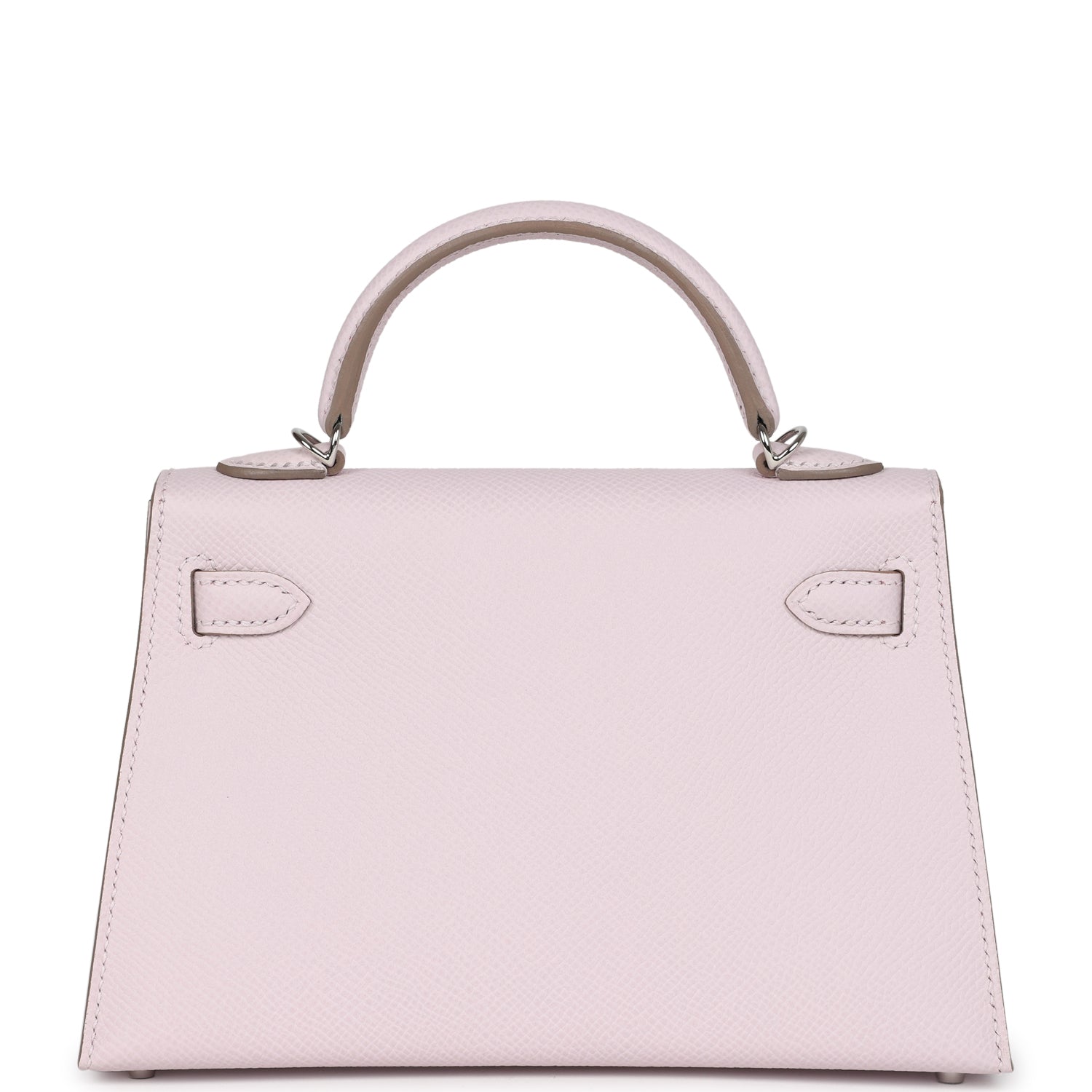 This Kelly, in the Sellier style, is in Mauve Pale epsom leather with palladium hardware and has tonal stitching, front flap, two straps with center toggle closure, single rolled handle and removable shoulder strap.