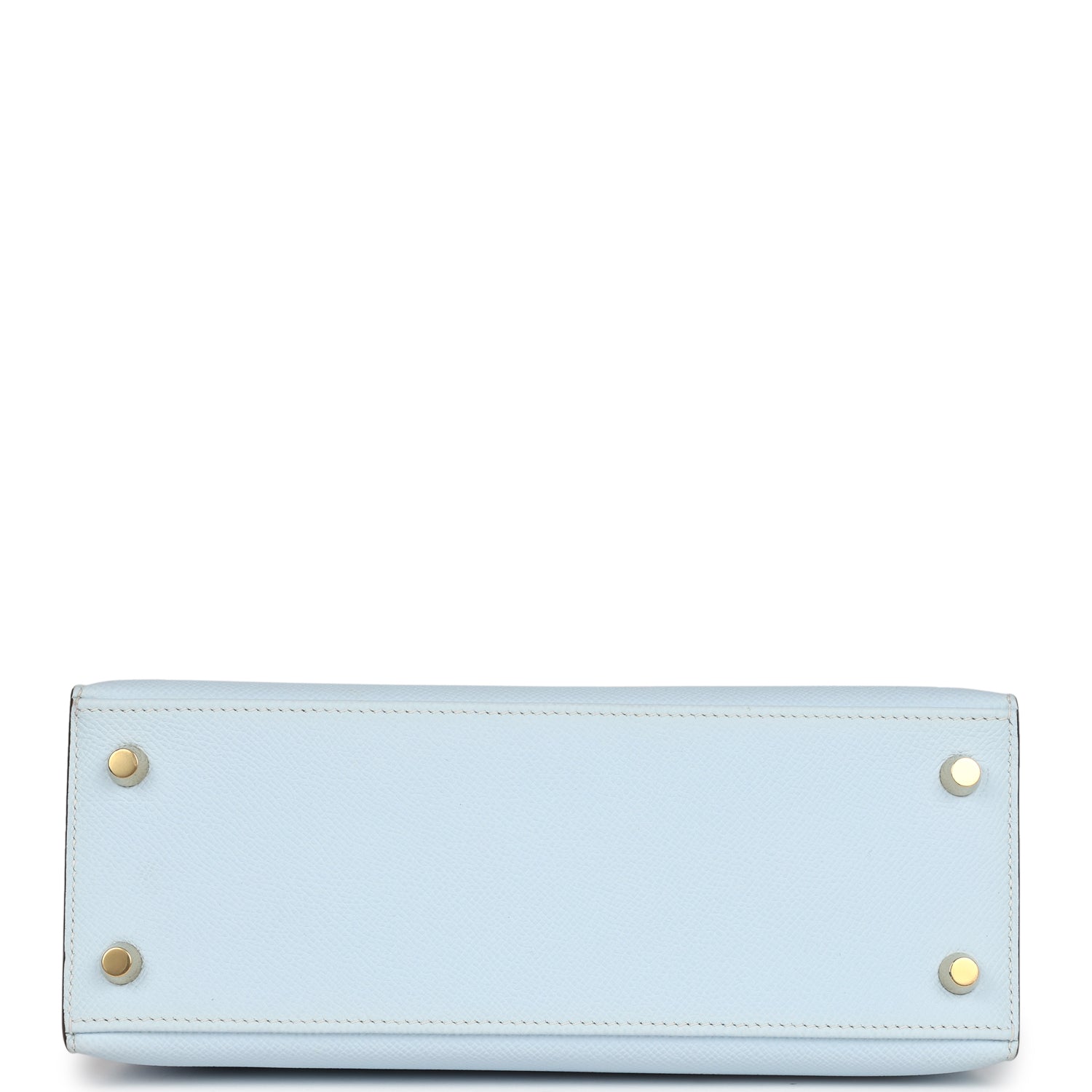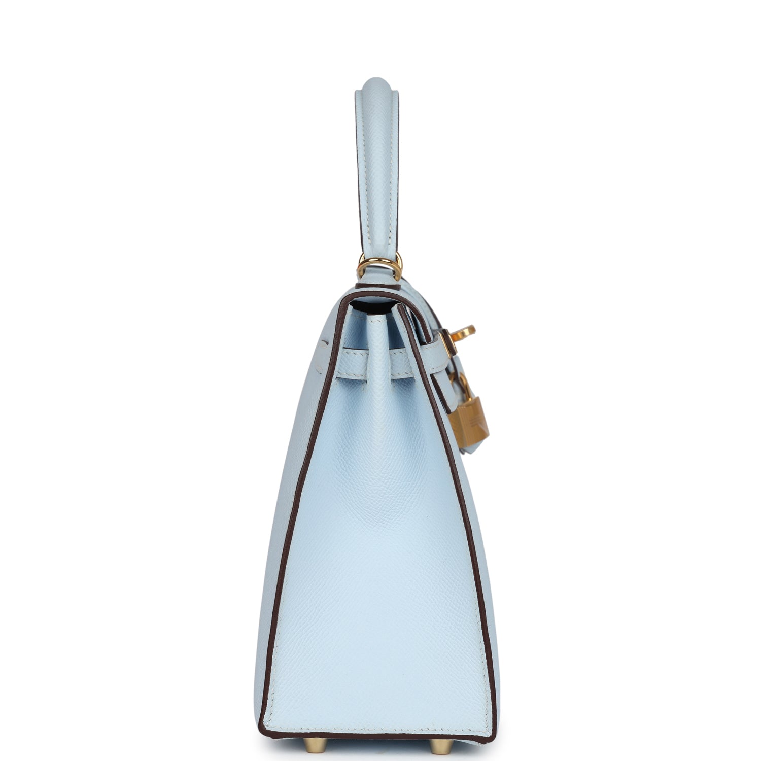 This Kelly, in the Sellier style, is in Bleu Brume epsom leather with gold hardware and has tonal stitching, front flap, two straps with center toggle closure, clochette with lock and two keys a single rolled handle and removable shoulder strap.