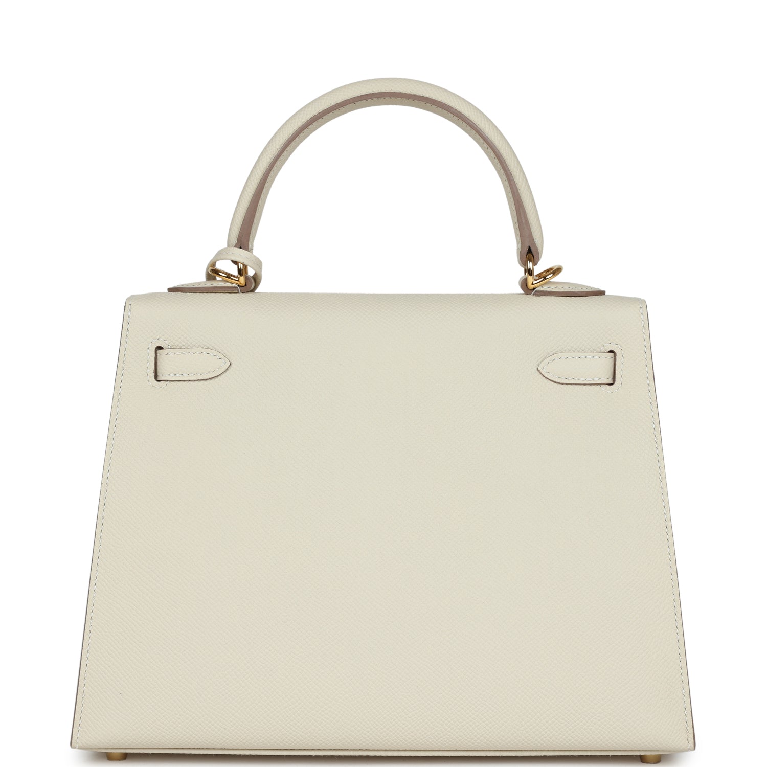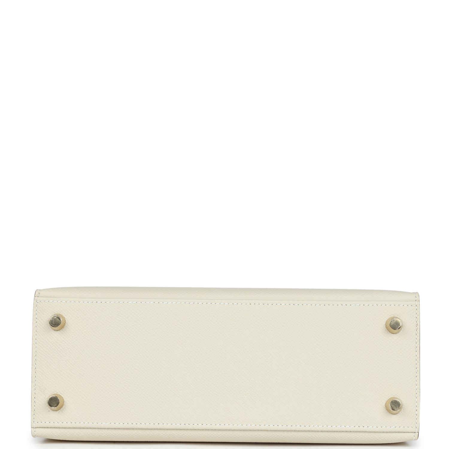 This Kelly, in the Sellier style, is in Craie epsom leather with Gold hardware and has tonal stitching, front flap, two straps with center toggle closure, clochette with lock and two keys, single rolled handle and removable shoulder strap.