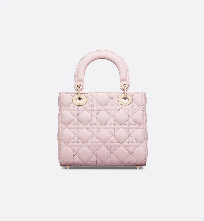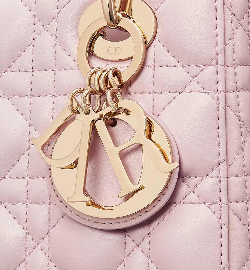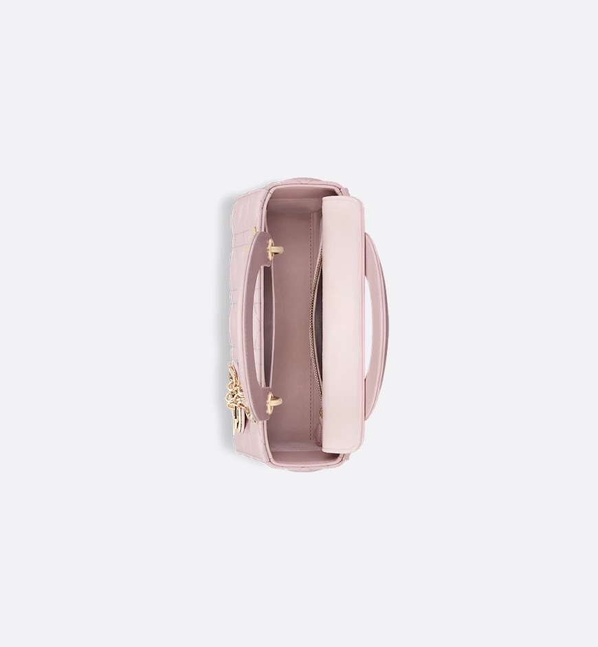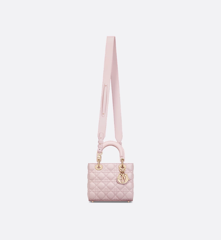 The Lady Dior My ABCDior bag epitomizes Dior's vision of elegance and beauty. Sleek and refined, the timeless style is crafted in pale pink lambskin with Cannage stitching, creating the unmistakable quilted texture. Pale gold-finish metal D.I.O.R. charms offer elegant appeal. Featuring a strap that can be personalized with symbolic badges, the small, unique design may be carried by hand or worn crossbody.