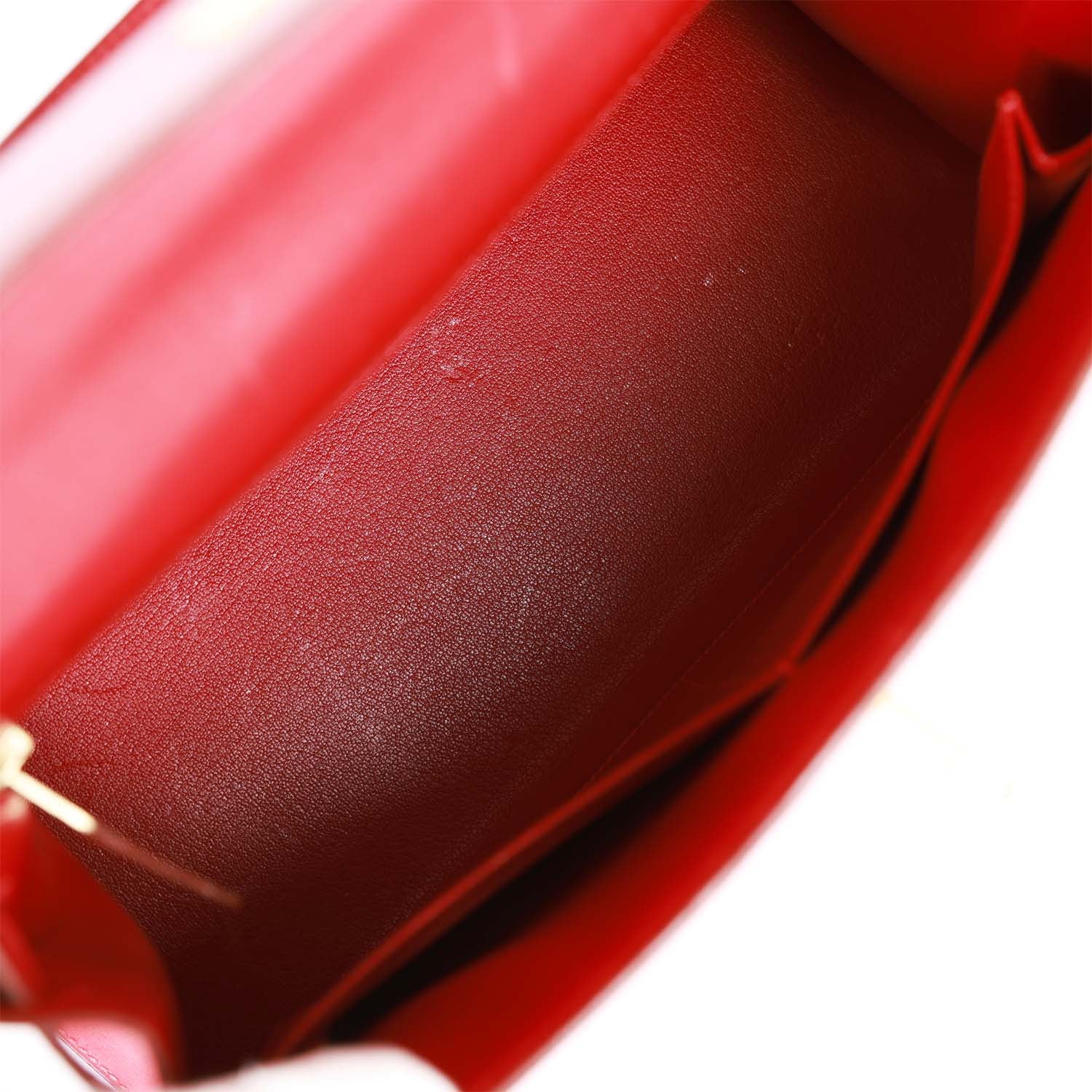 This Kelly, in the Sellier style, is ofRouge Vifboxcalf leather with gold hardware and features tonal stitching, a front toggle closure, a clochette with lock and two keys and a single rolled handle.