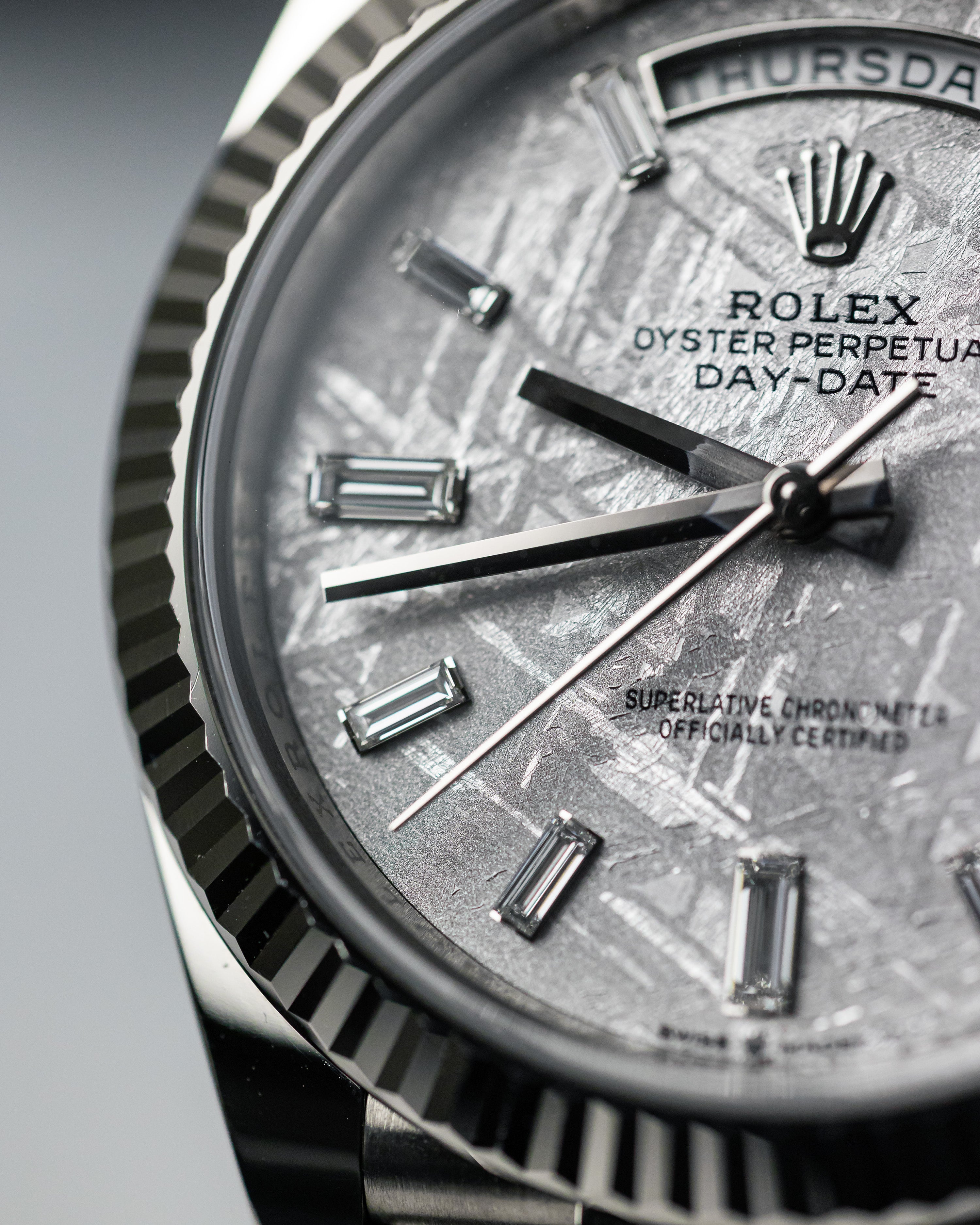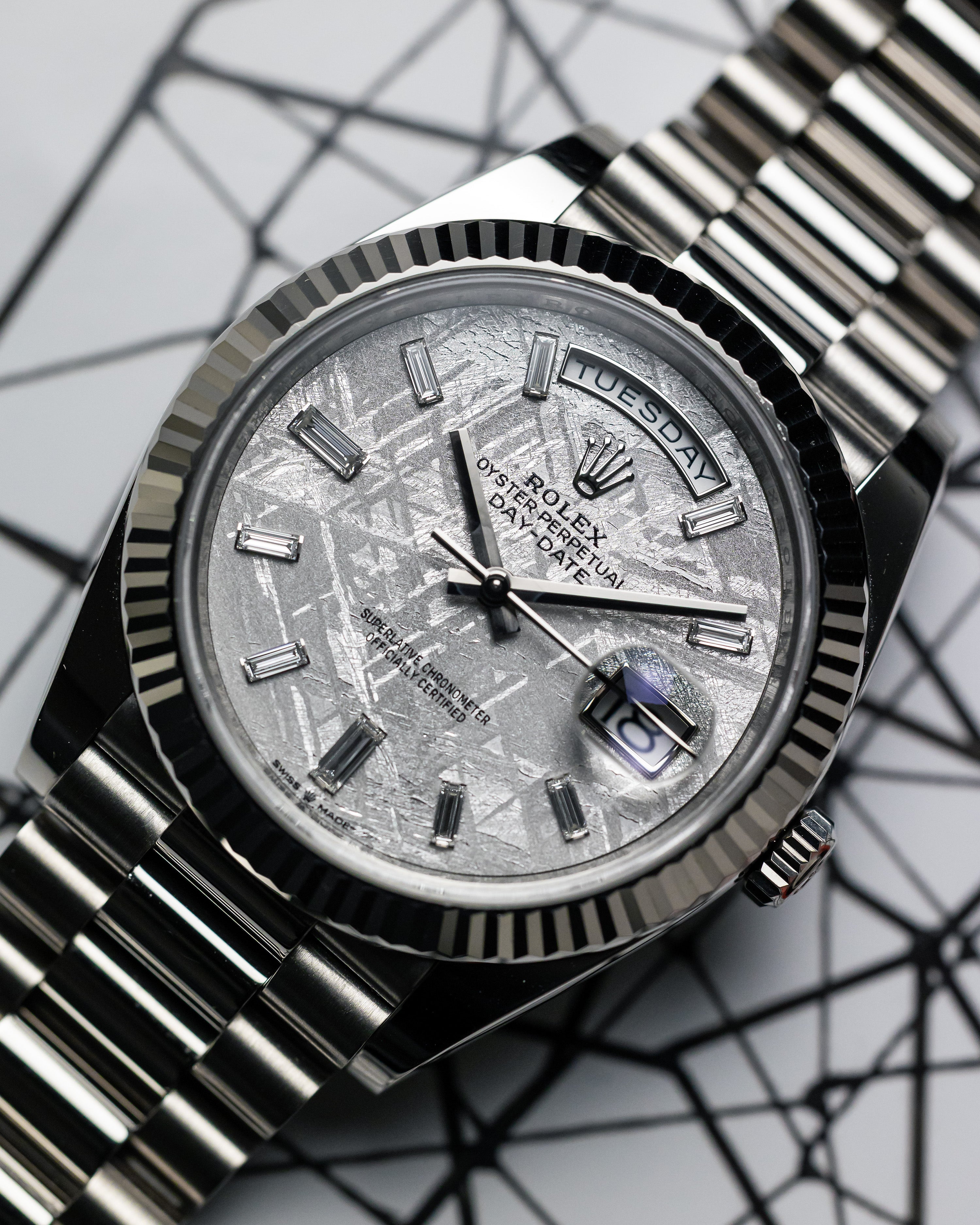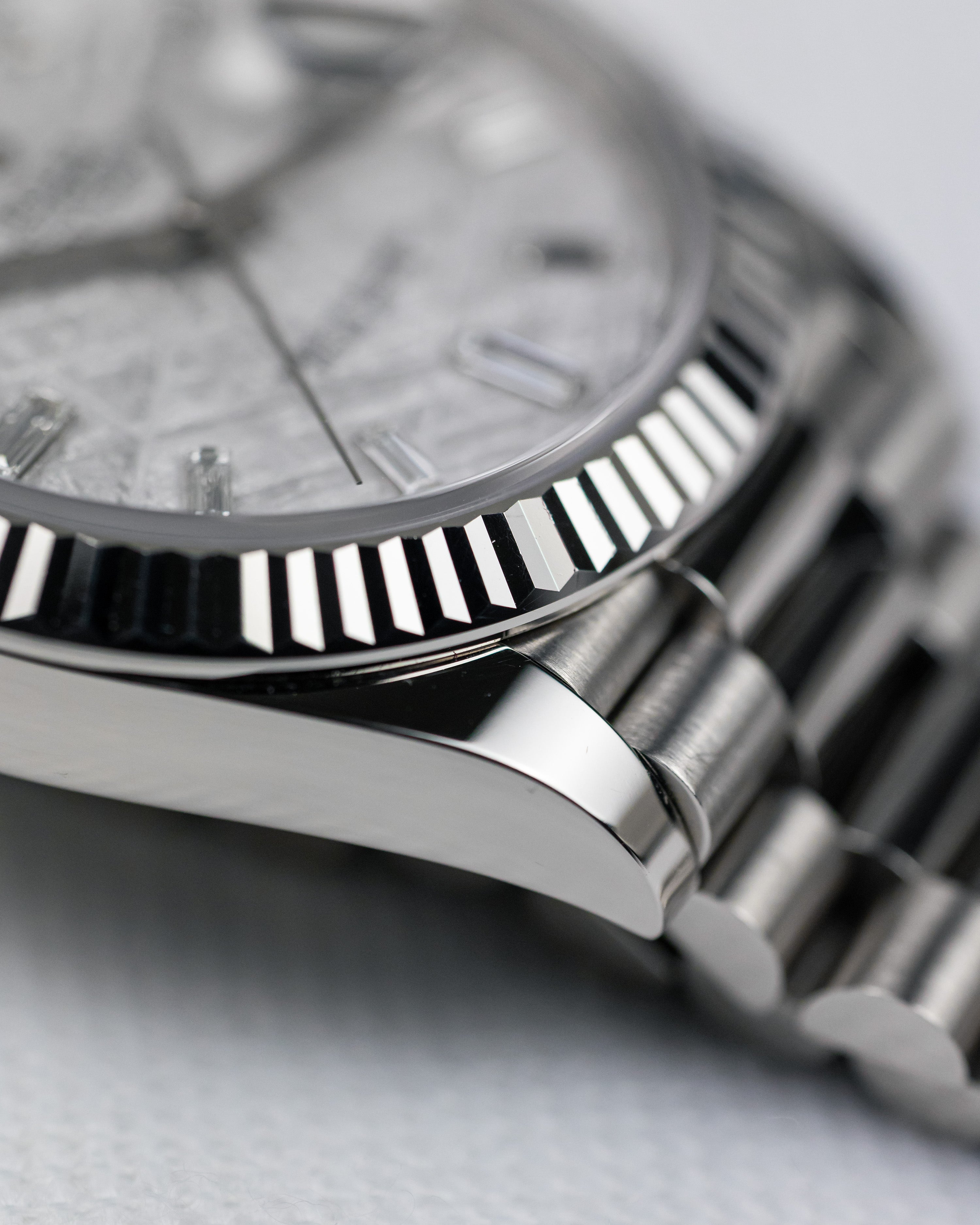 With no two being alike, the meteorite dial stands out for its uniqueness. The factory set diamond hour markers paired with the president bracelet crafted in white gold truly celebrates the perfect fusion of sleek luxury and comfort.