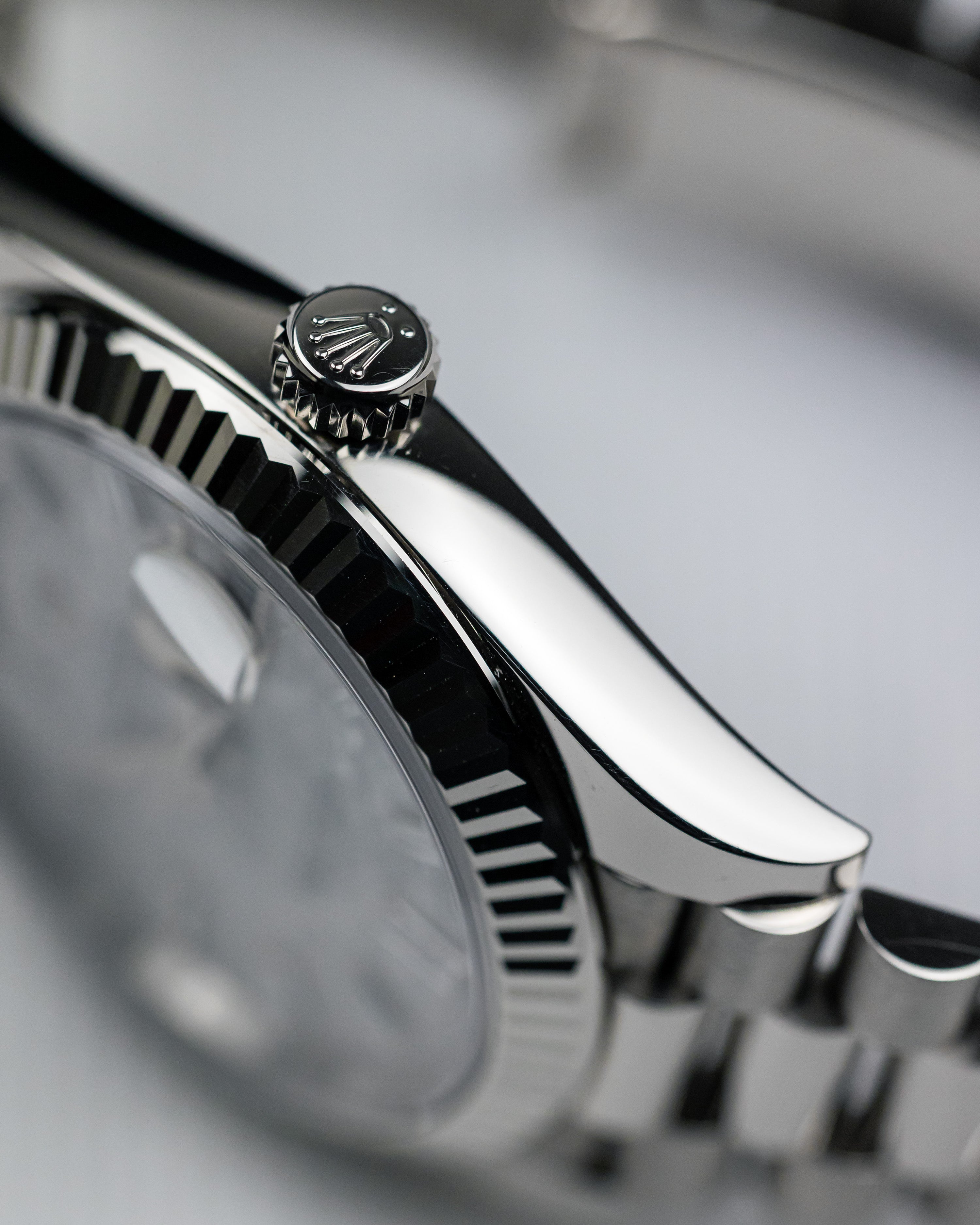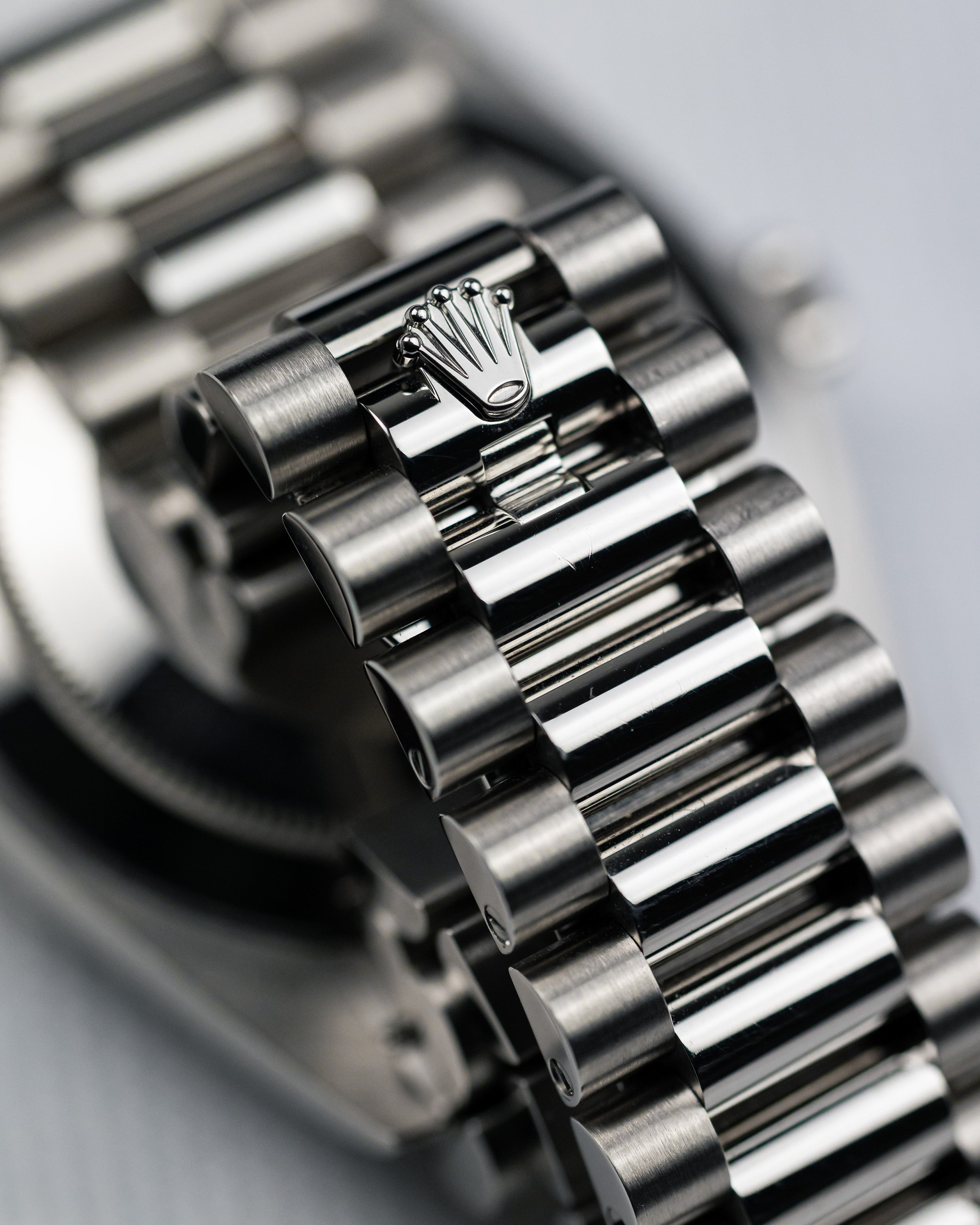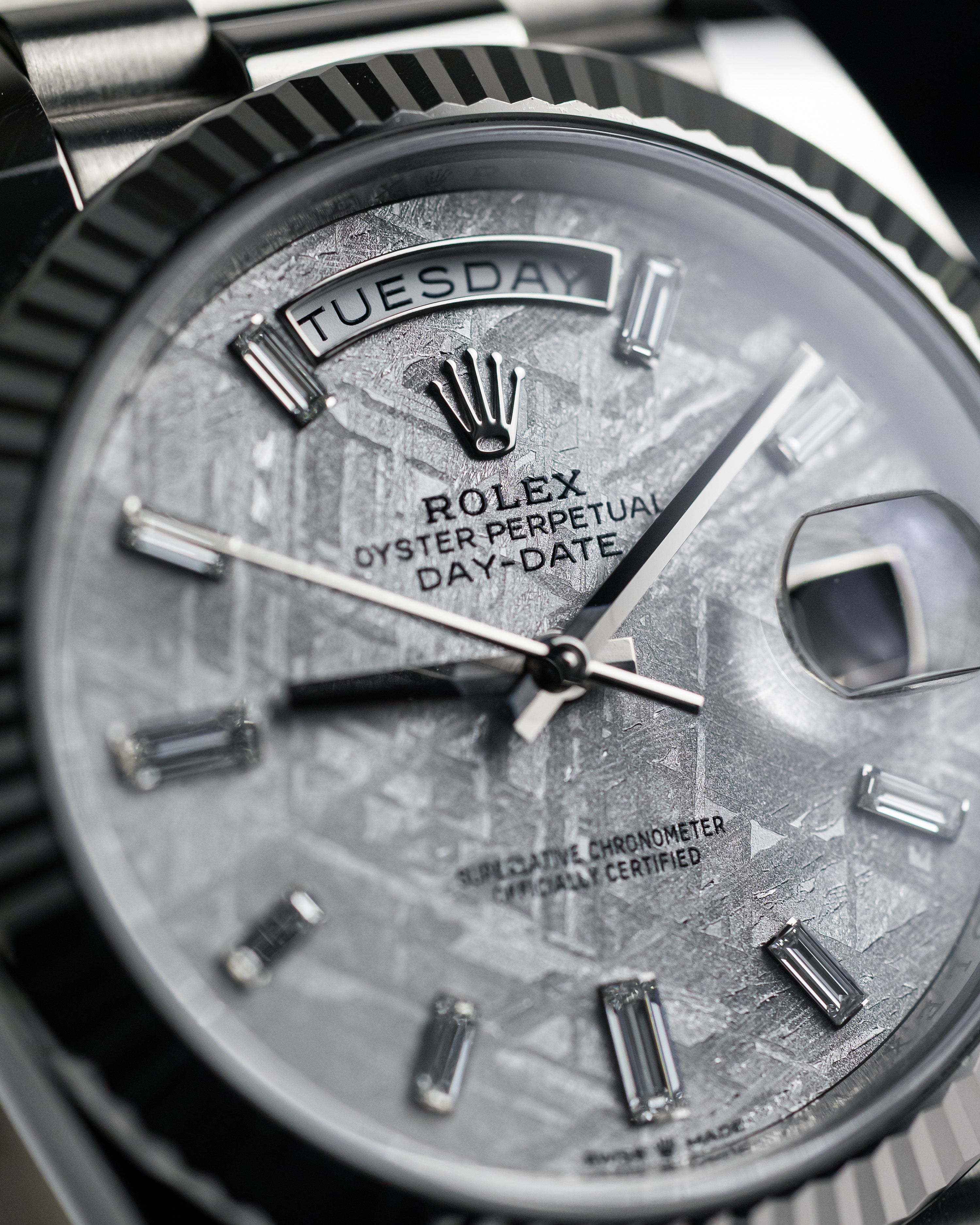 With no two being alike, the meteorite dial stands out for its uniqueness. The factory set diamond hour markers paired with the president bracelet crafted in white gold truly celebrates the perfect fusion of sleek luxury and comfort.