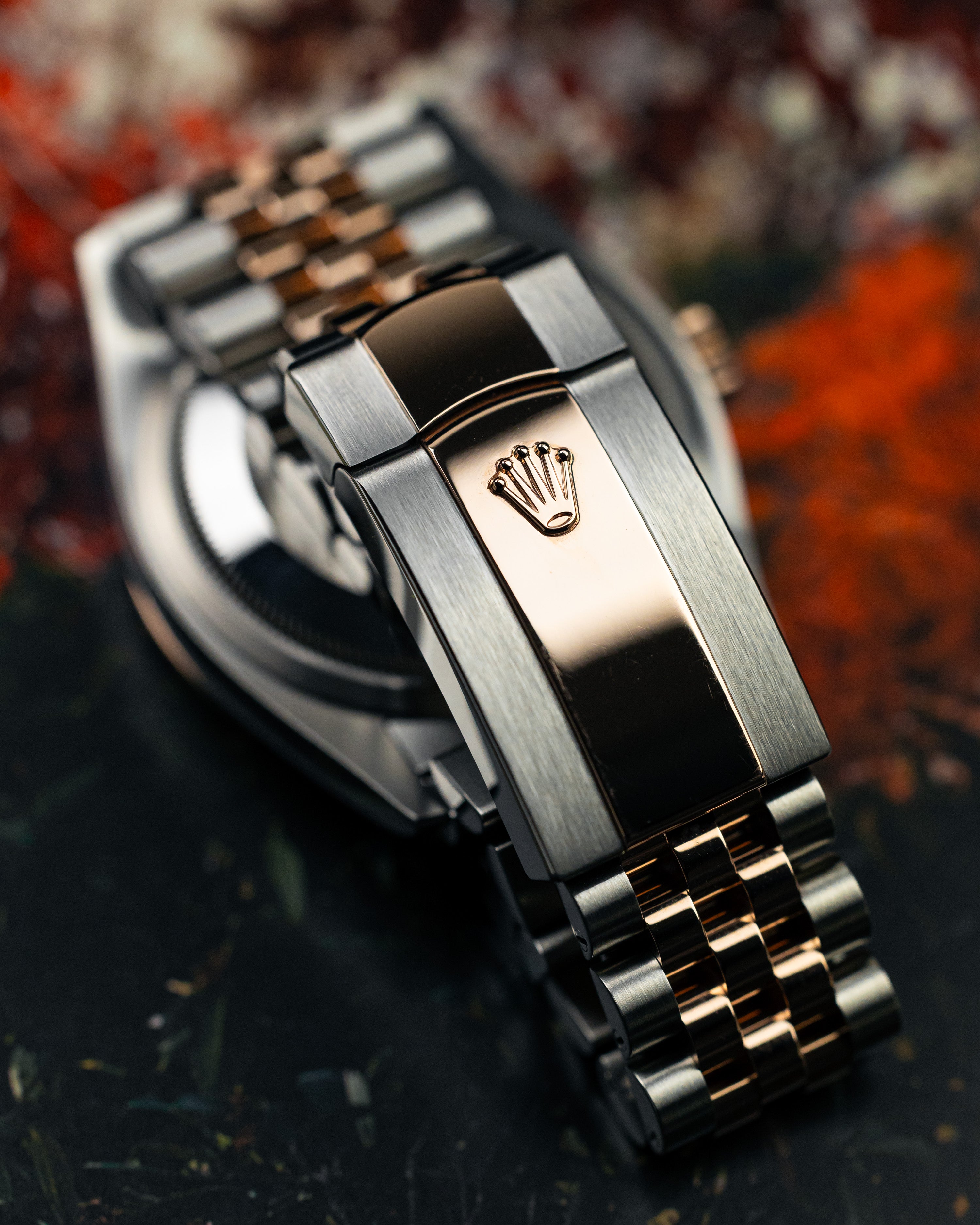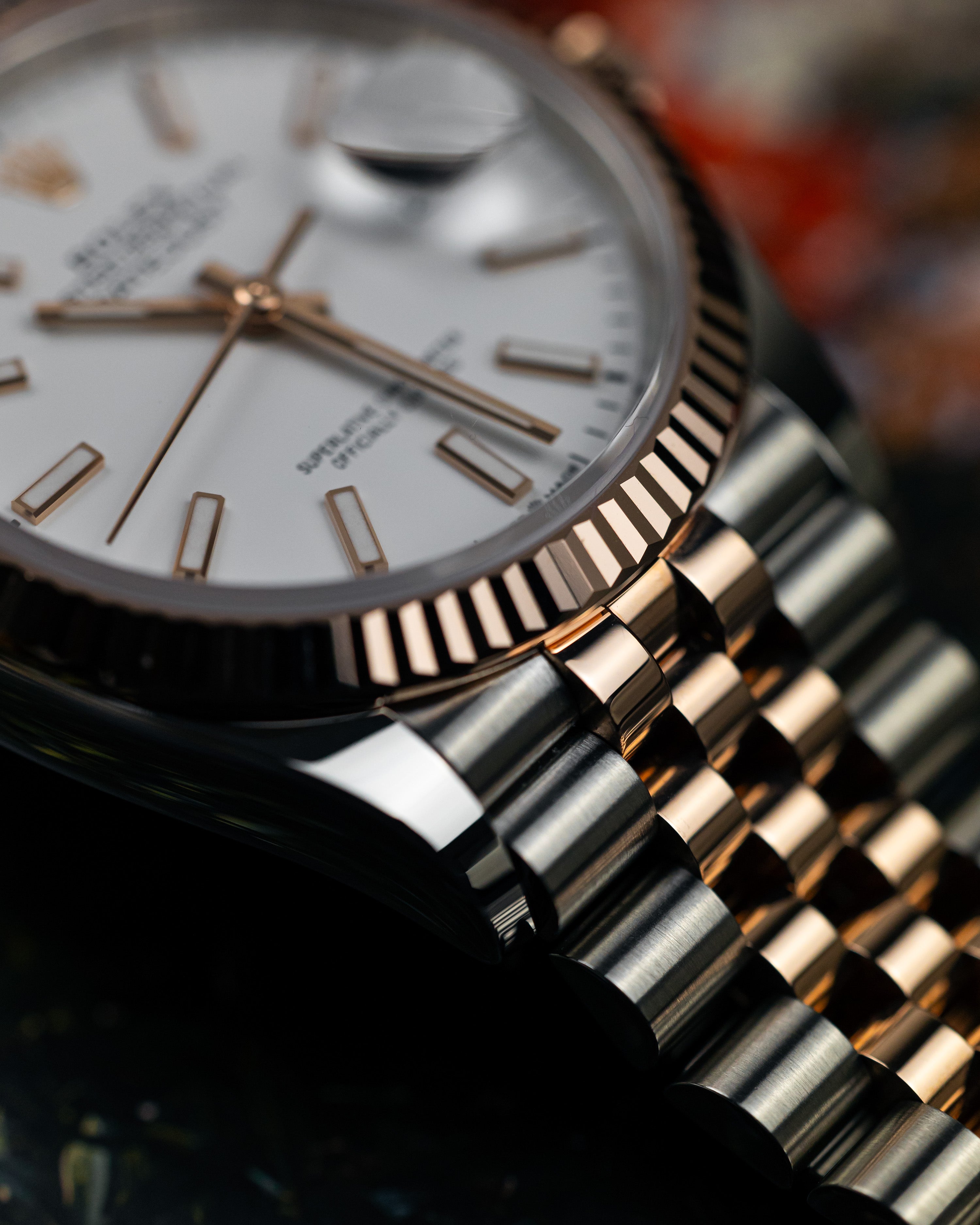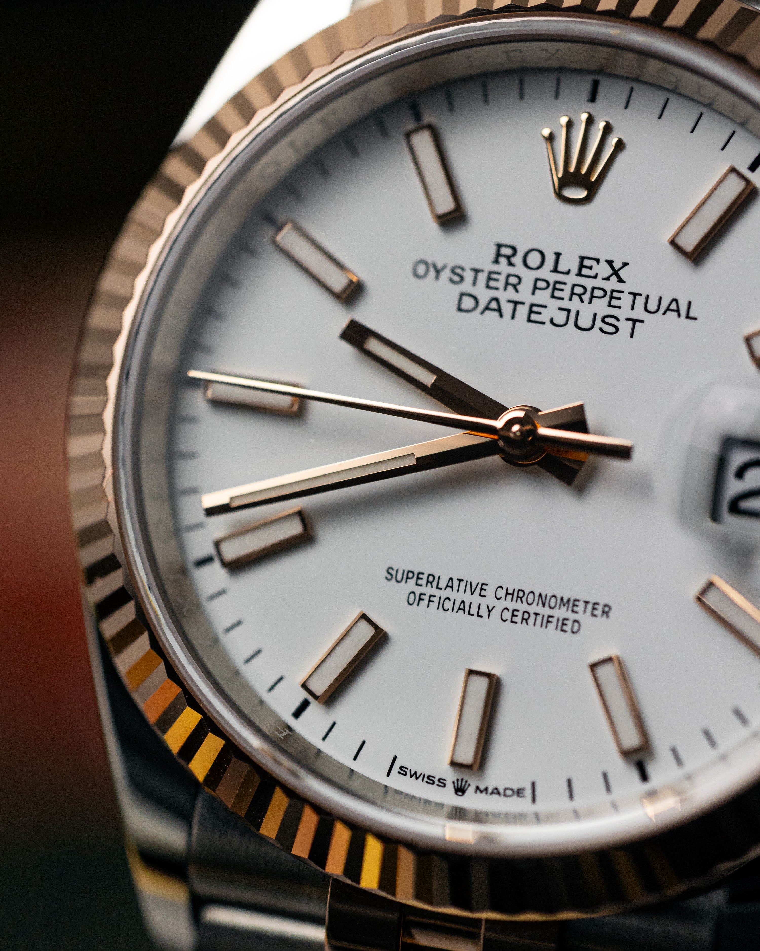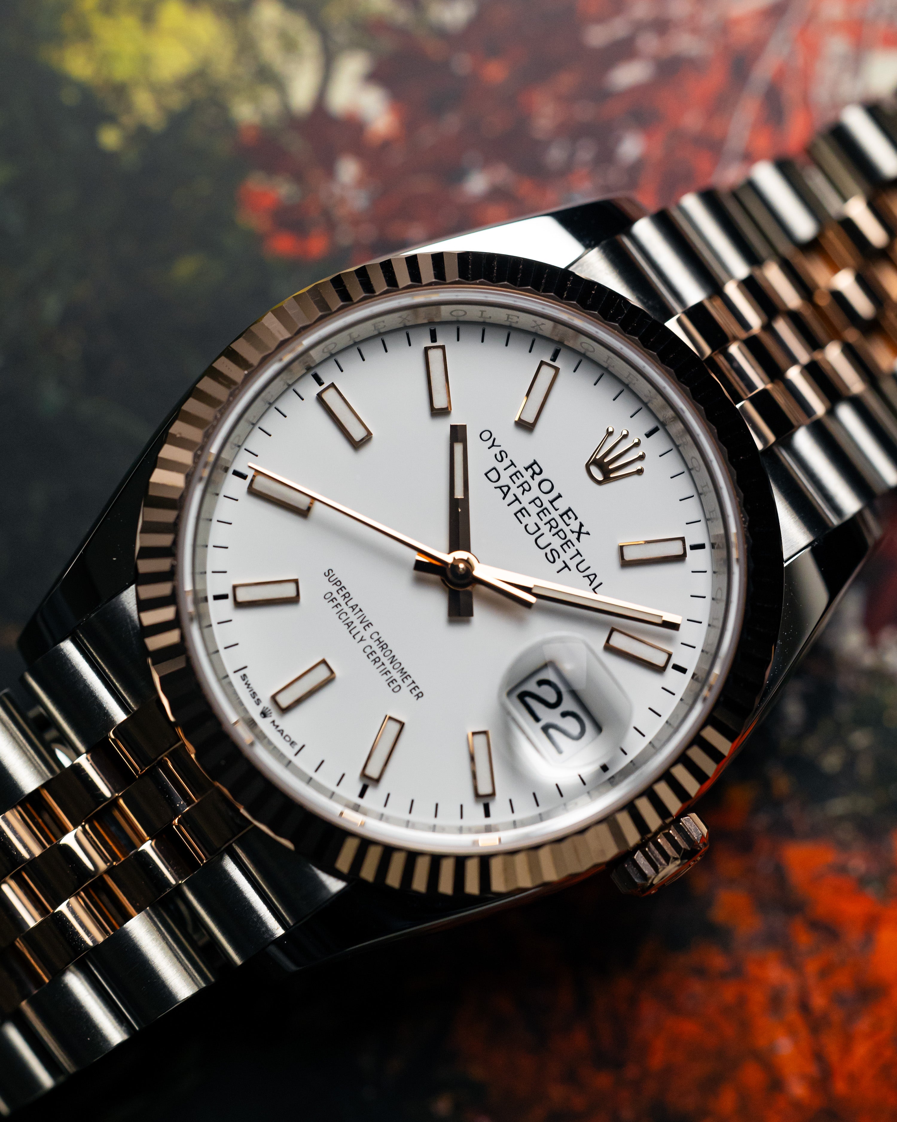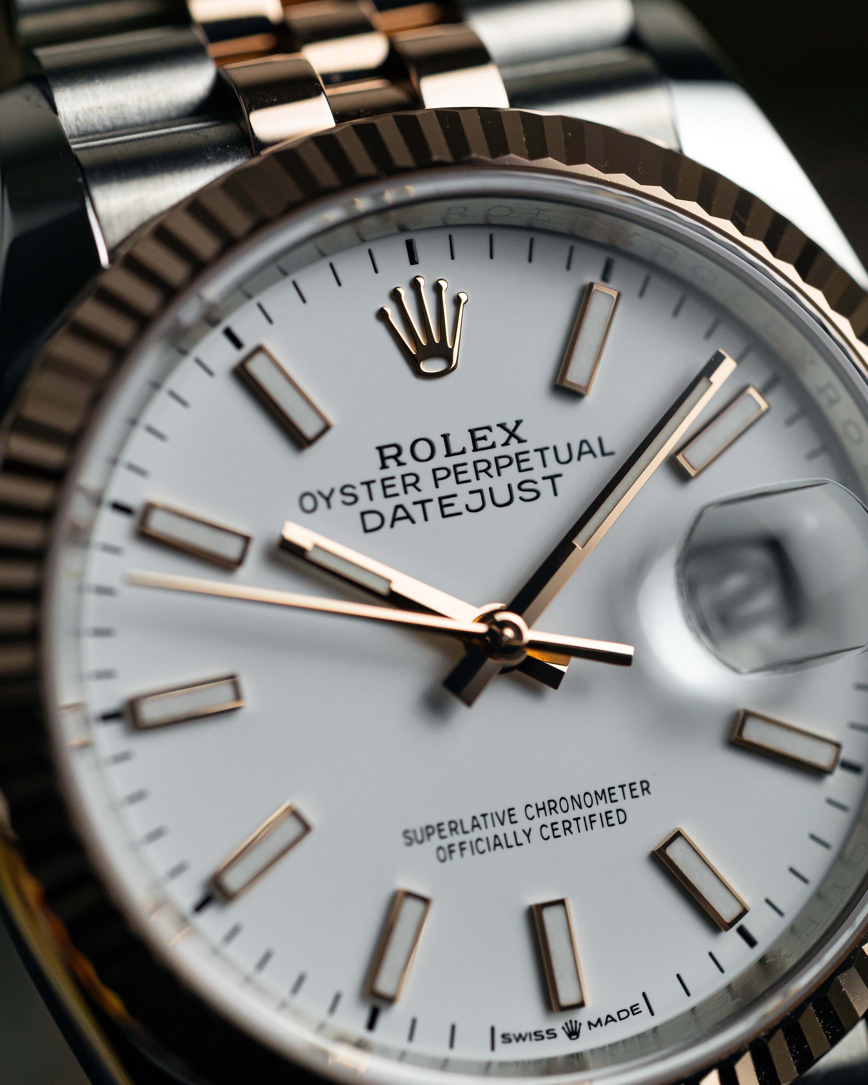 Simple yet sophisticated with the blend of steel and rose gold paired with the timeless white dial completed with the favourable jubilee bracelet and fluted bezel.